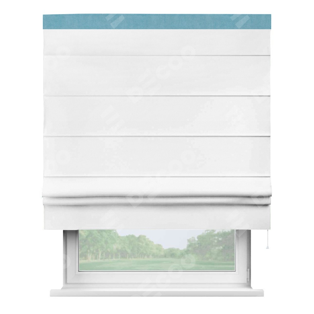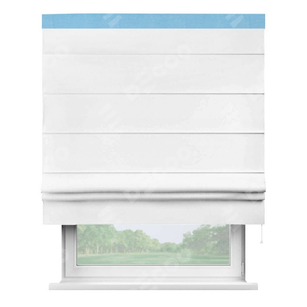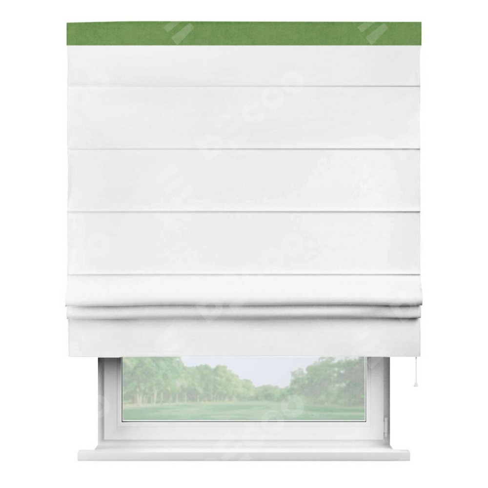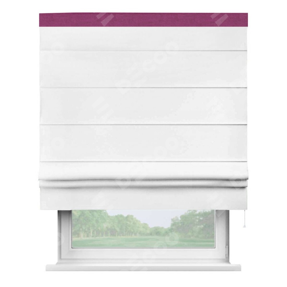 Римская штора производителя «Cortin», используется для проёма, пошита из ткани вельвет белый, артикул ткани 10810. Отделка шторы кантом «Кинг», ткань для канта используется из вельвета разной расцветки на выбор. Имеет универсальный механизм и подходит для монтажа: на потолок, на стену и в нишу.