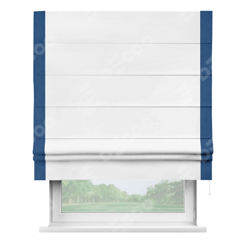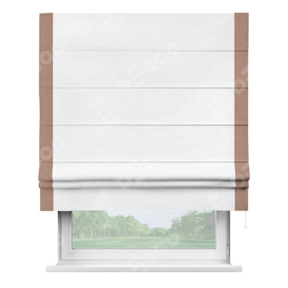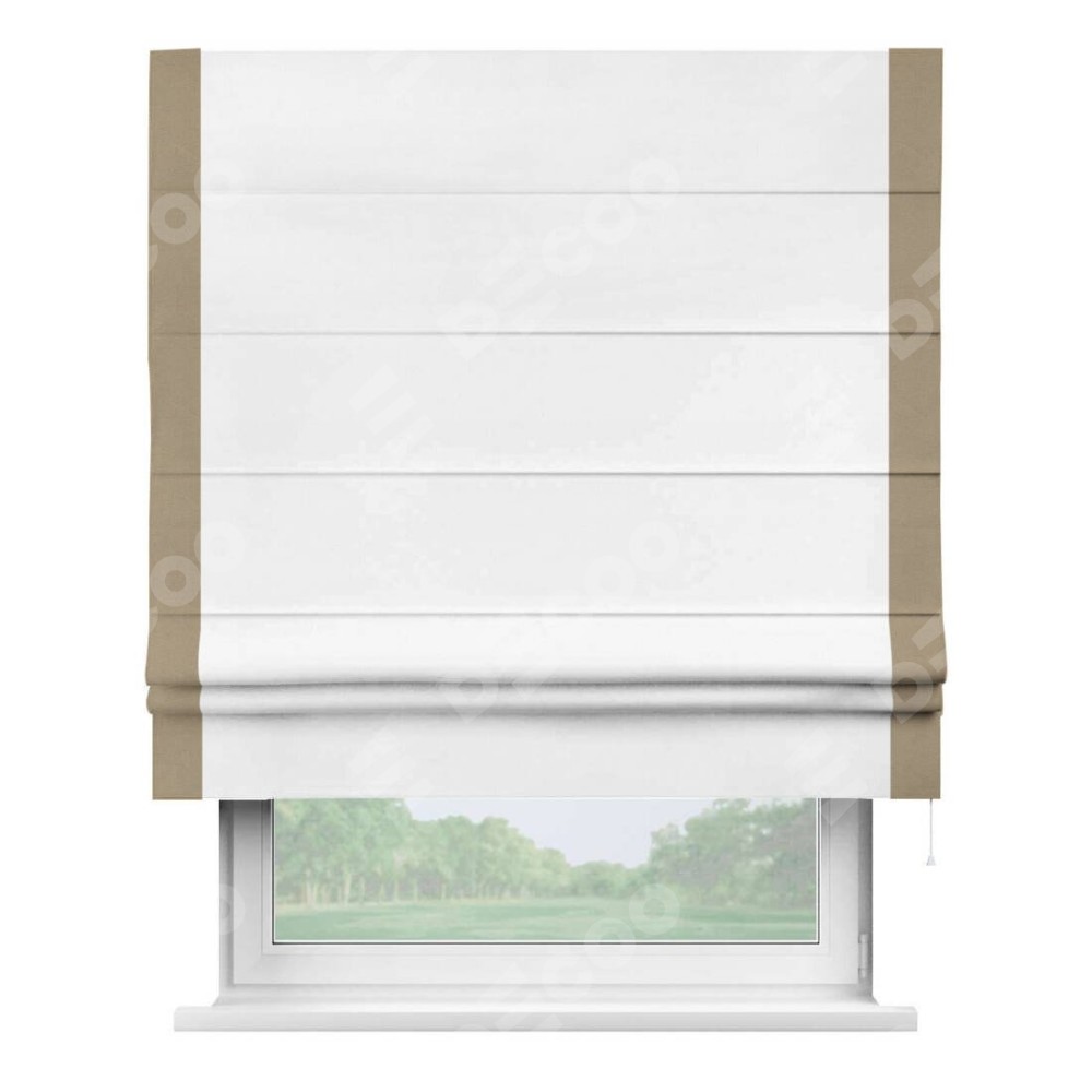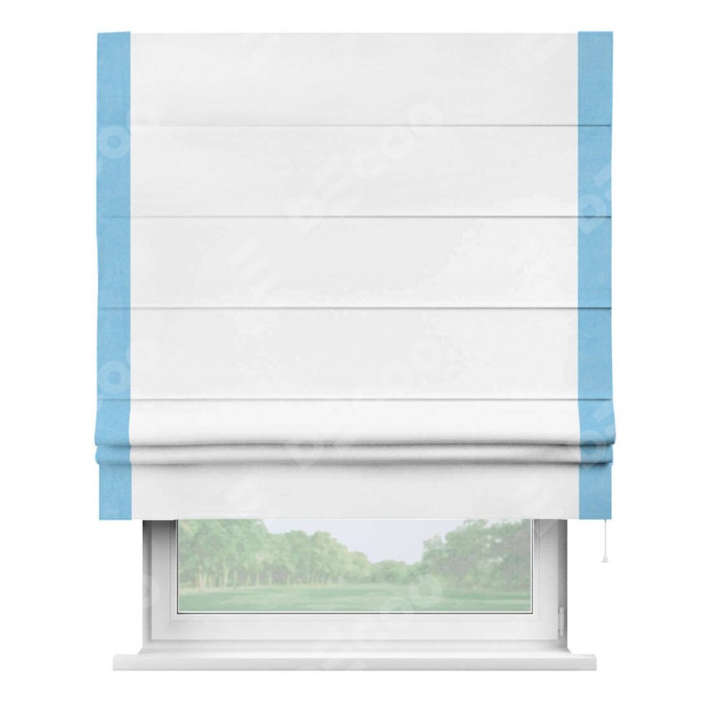 Римская штора производителя «Cortin», используется для проёма, пошита из ткани вельвет белый, артикул ткани 10810. Отделка шторы кантом «Стрим Дуо», ткань для канта используется из вельвета разной расцветки на выбор. Имеет универсальный механизм и подходит для монтажа: на потолок, на стену и в нишу.
