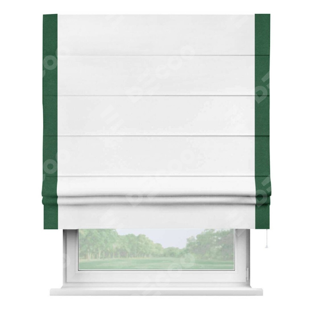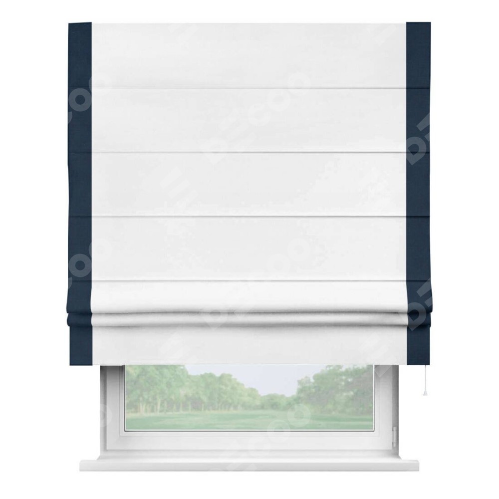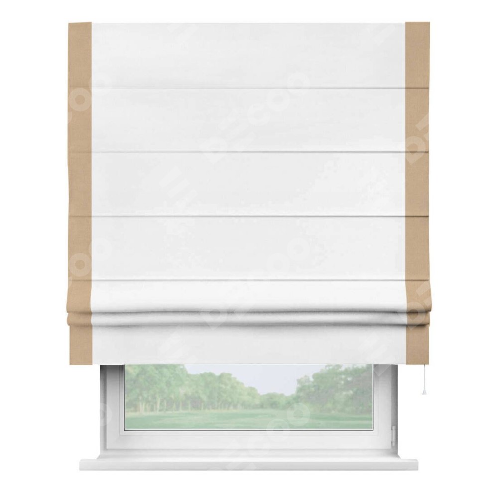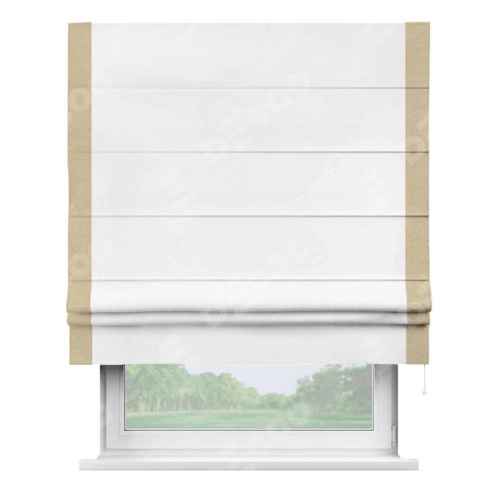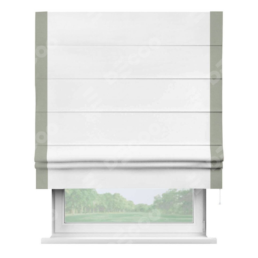 Римская штора производителя «Cortin», используется для проёма, пошита из ткани вельвет белый, артикул ткани 10810. Отделка шторы кантом «Стрим Дуо», ткань для канта используется из вельвета разной расцветки на выбор. Имеет универсальный механизм и подходит для монтажа: на потолок, на стену и в нишу.