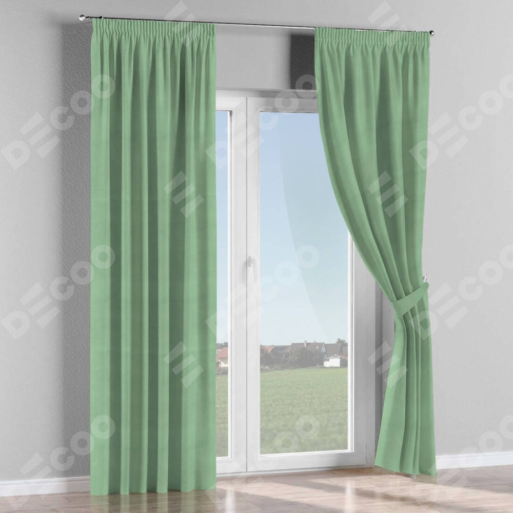 Комплект прямых штор, от производителя «Cortin», пошиты из ткани бархат оливковый, артикул ткани 18746. С изнаночной стороны в верхней части штор пристрачивается шторная лента с декоративными складками «Карандаш». Для создания элегантных складок прямые шторы шьются по стандарту с коэффициентом 1:2 (на 100 см. ширины проёма 200 см. ширины ткани).