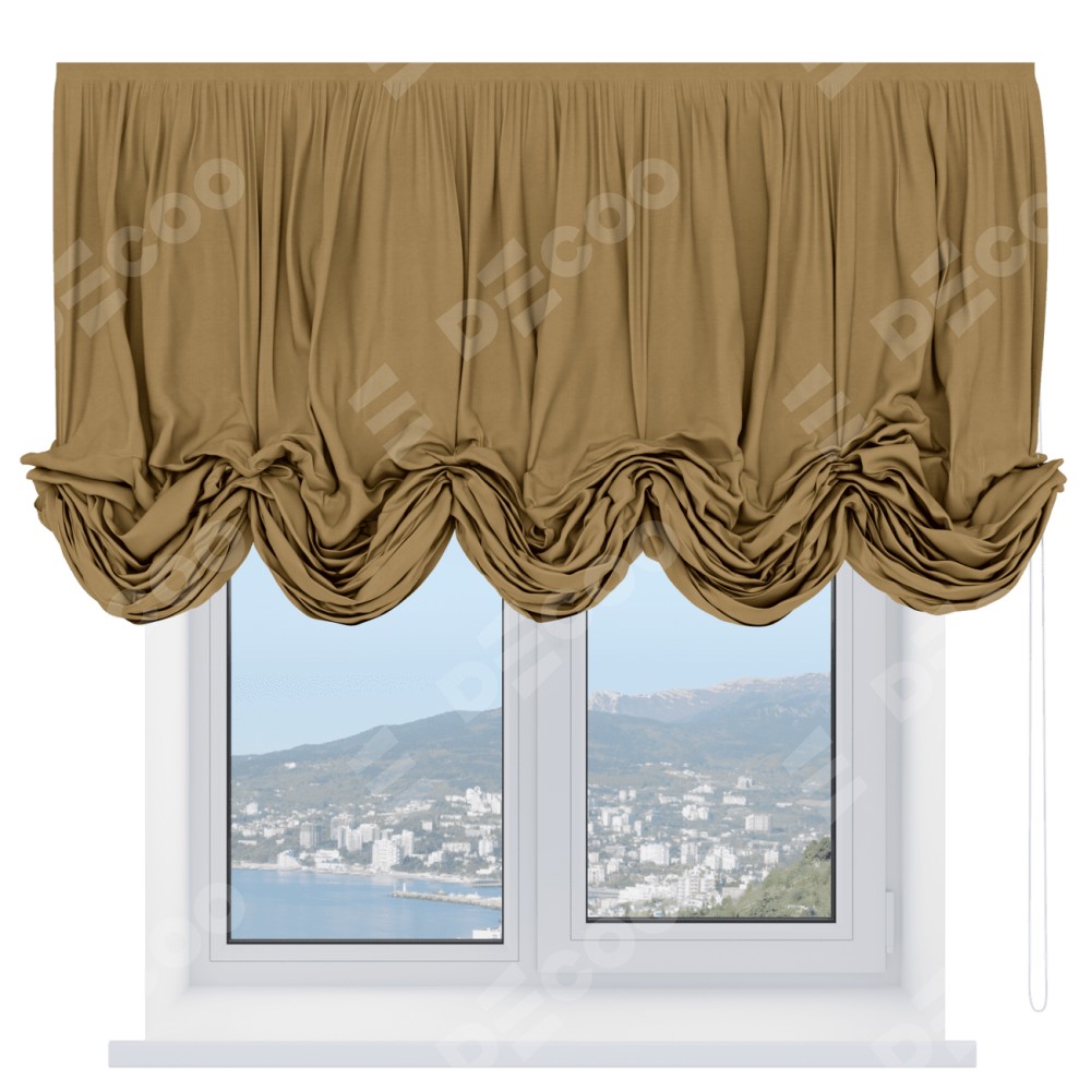 Австрийская штора производителя «Cortin», используется для проёма, пошита из ткани вельвет горчица, артикул ткани 17760. Имеет универсальный механизм и подходит для монтажа: на потолок и на стену.