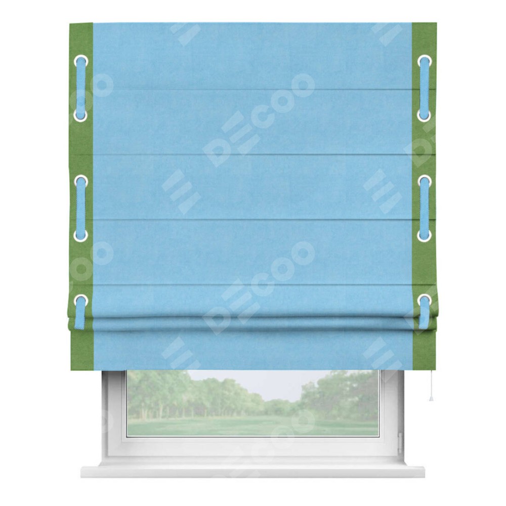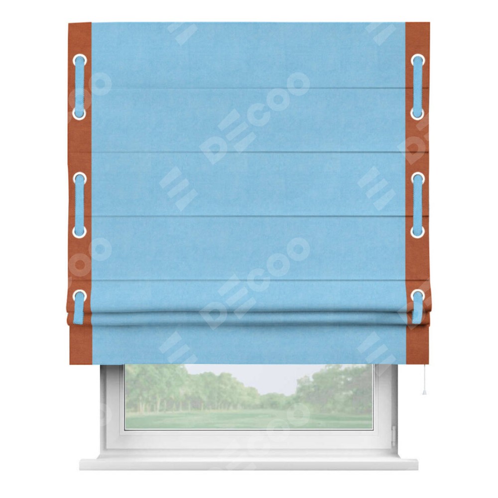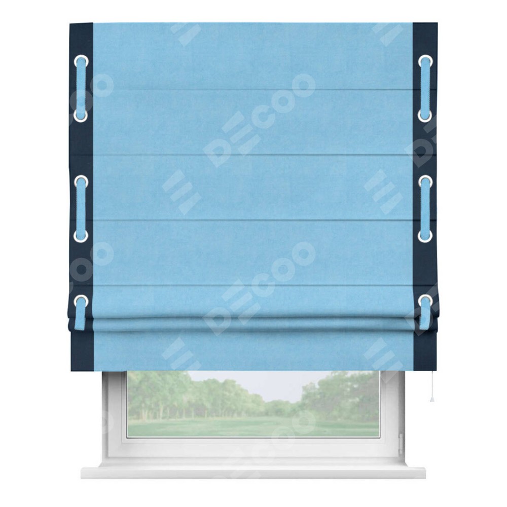 Римская штора производителя «Cortin», используется для проёма, пошита из ткани вельвет голубой, артикул ткани 85544. Отделка шторы кантом «Стрим Дуо» на кантах расположены люверсы с пояском, ткань для канта используется из вельвета разной расцветки на выбор. Ткань для пояска обычно используется из основной ткани шторы, а так же можно сделать из любой расцветки по желанию. Имеет универсальный механизм и подходит для монтажа: на потолок, на стену и в нишу.
