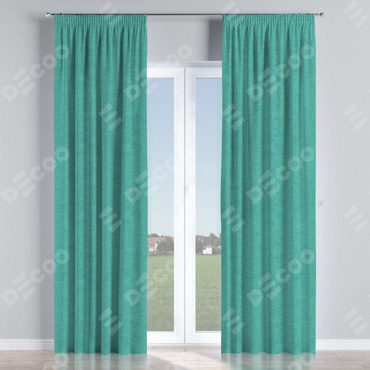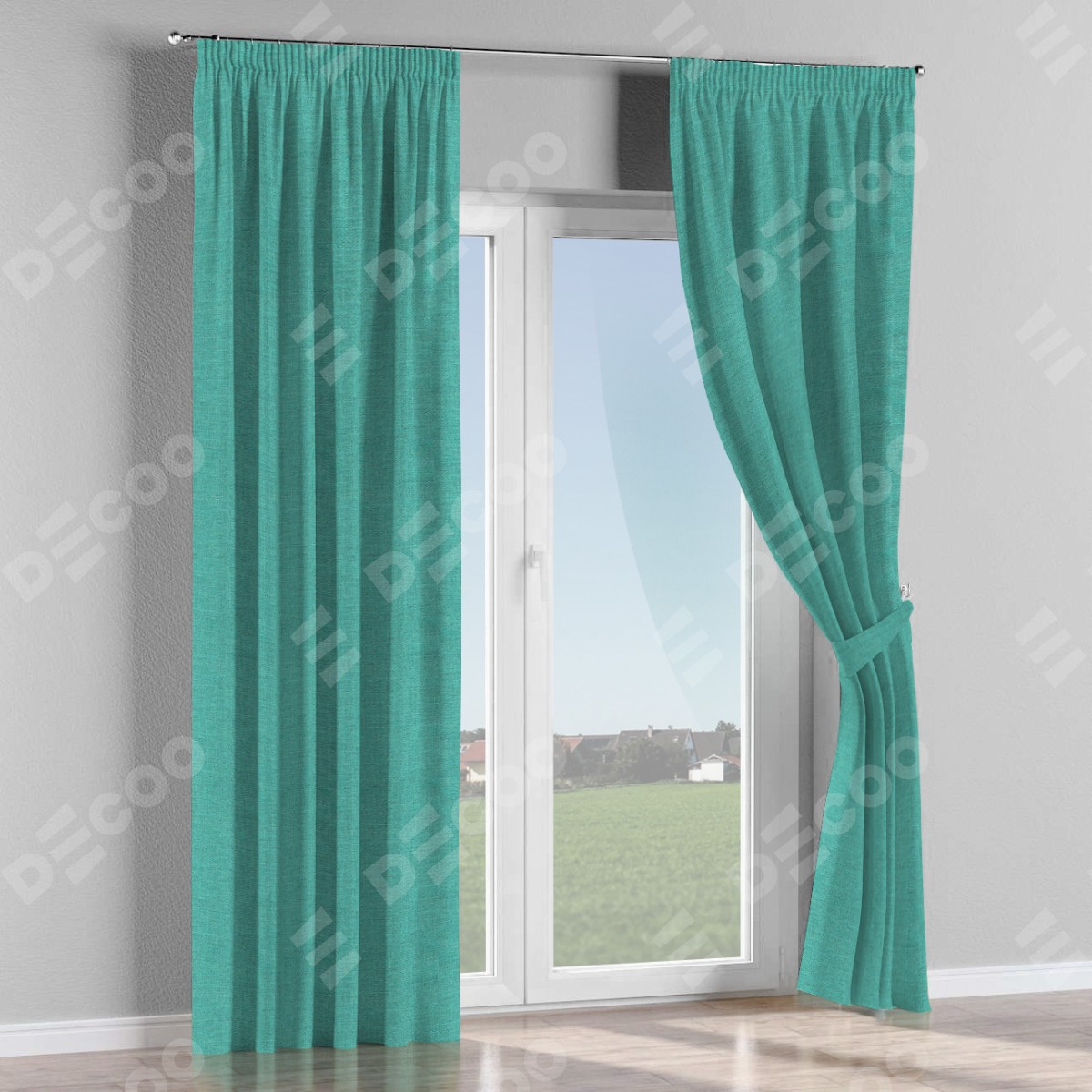 Комплект прямых штор, от производителя «Cortin», пошиты из ткани лён изумрудный, артикул ткани 85908. С изнаночной стороны в верхней части штор пристрачивается шторная лента с декоративными складками «Карандаш». Для создания элегантных складок прямые шторы шьются по стандарту с коэффициентом 1:2 (на 100 см. ширины проёма 200 см. ширины ткани).