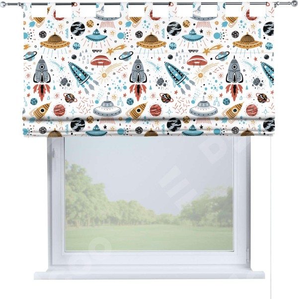 Римская штора производителя «Cortin», используется для проёма, пошита из ткани блэкаут с нанесением сублимационной печати «Космическое приключение». Данная модель пошита на петлях, комплектуется на выбор круглым карнизом и подходит для монтажа на стену. Римская штора на петлях имеет простую систему регулировки высоты, отличительным преимуществом данной модели является простой способ монтажа. Достаточно повесить ее на трубу и штора готова!