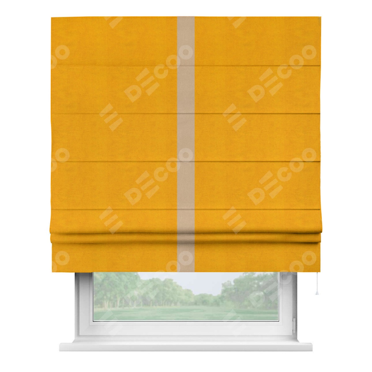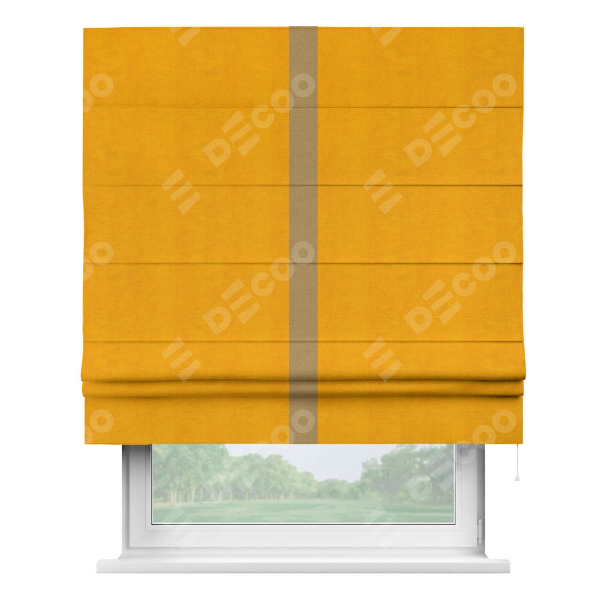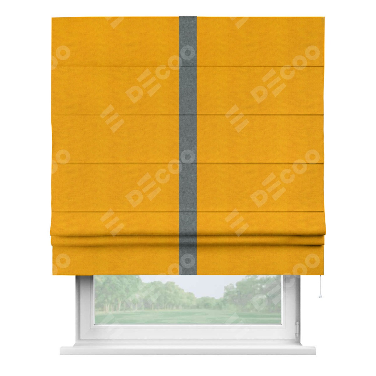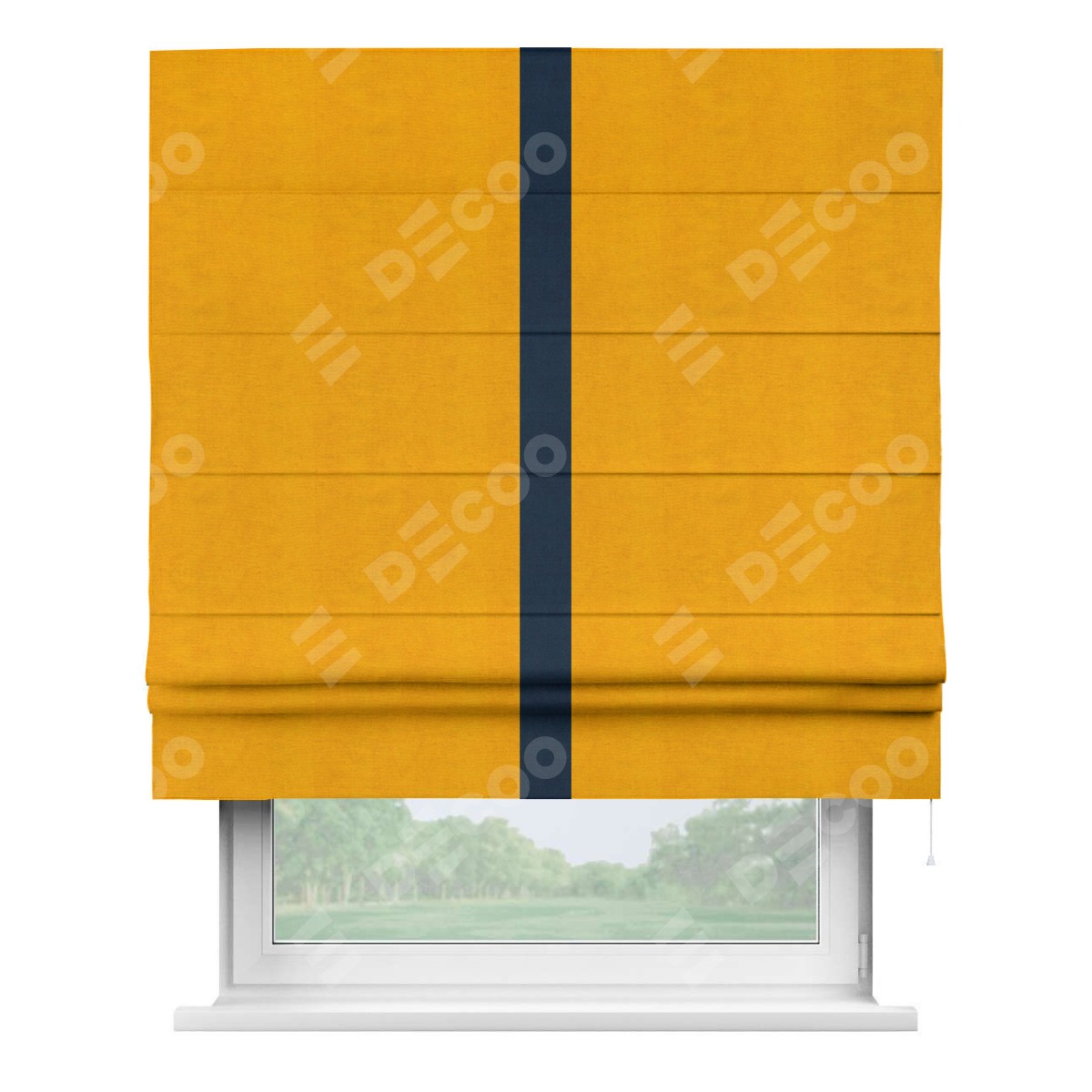Римская штора производителя «Cortin», используется для проёма, пошита из ткани вельвет желтый, артикул ткани 85547. Отделка шторы кантом «Хайвей», ткань для канта используется из вельвета разной расцветки на выбор. Имеет универсальный механизм и подходит для монтажа: на потолок, на стену и в нишу.