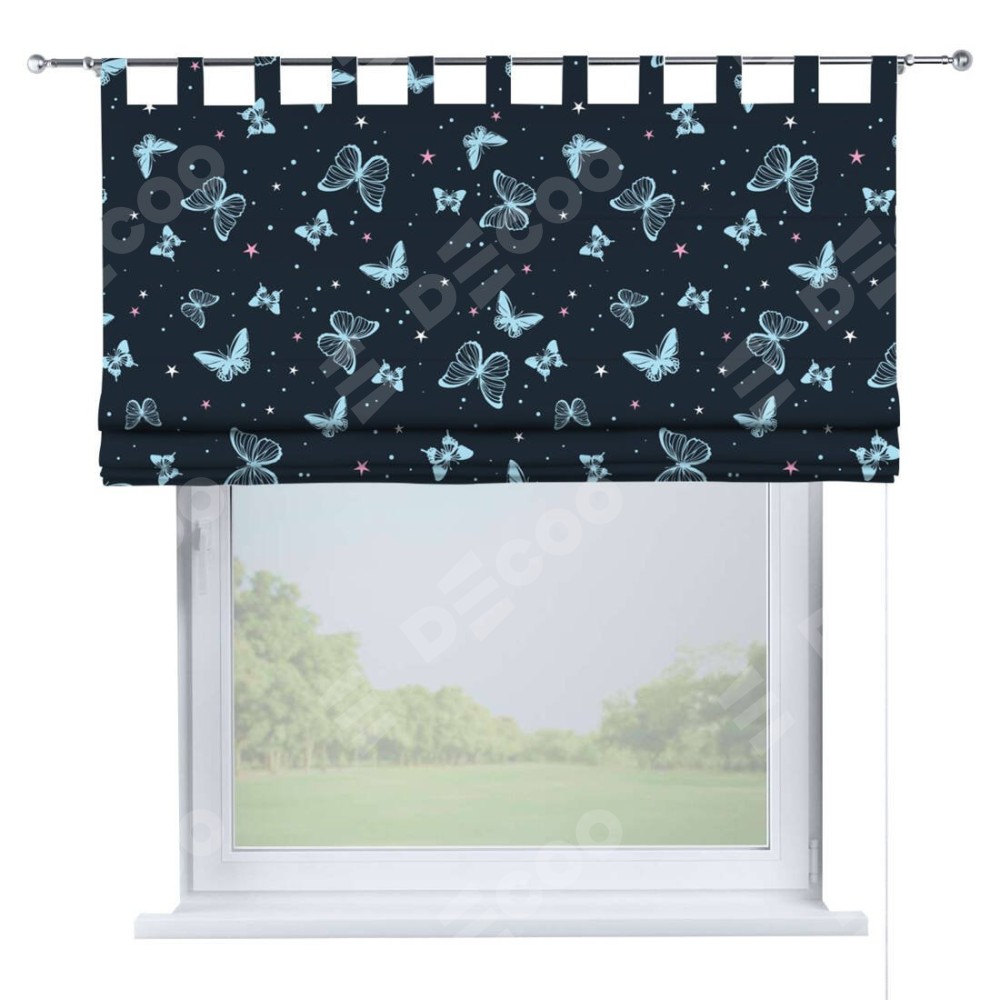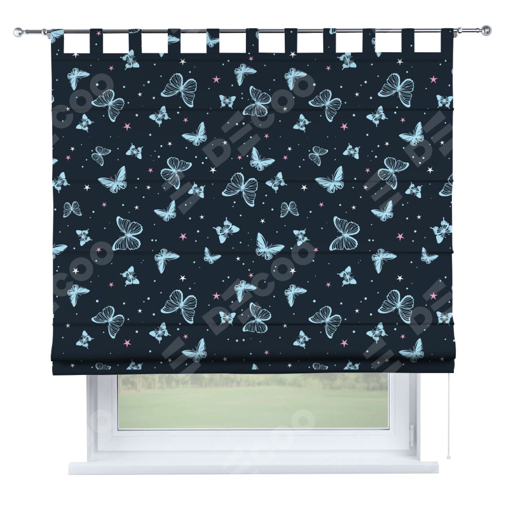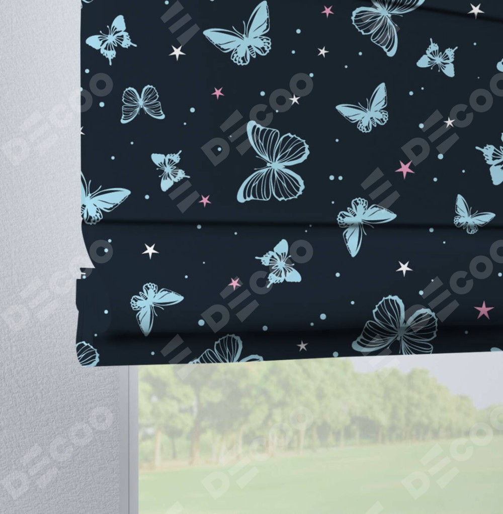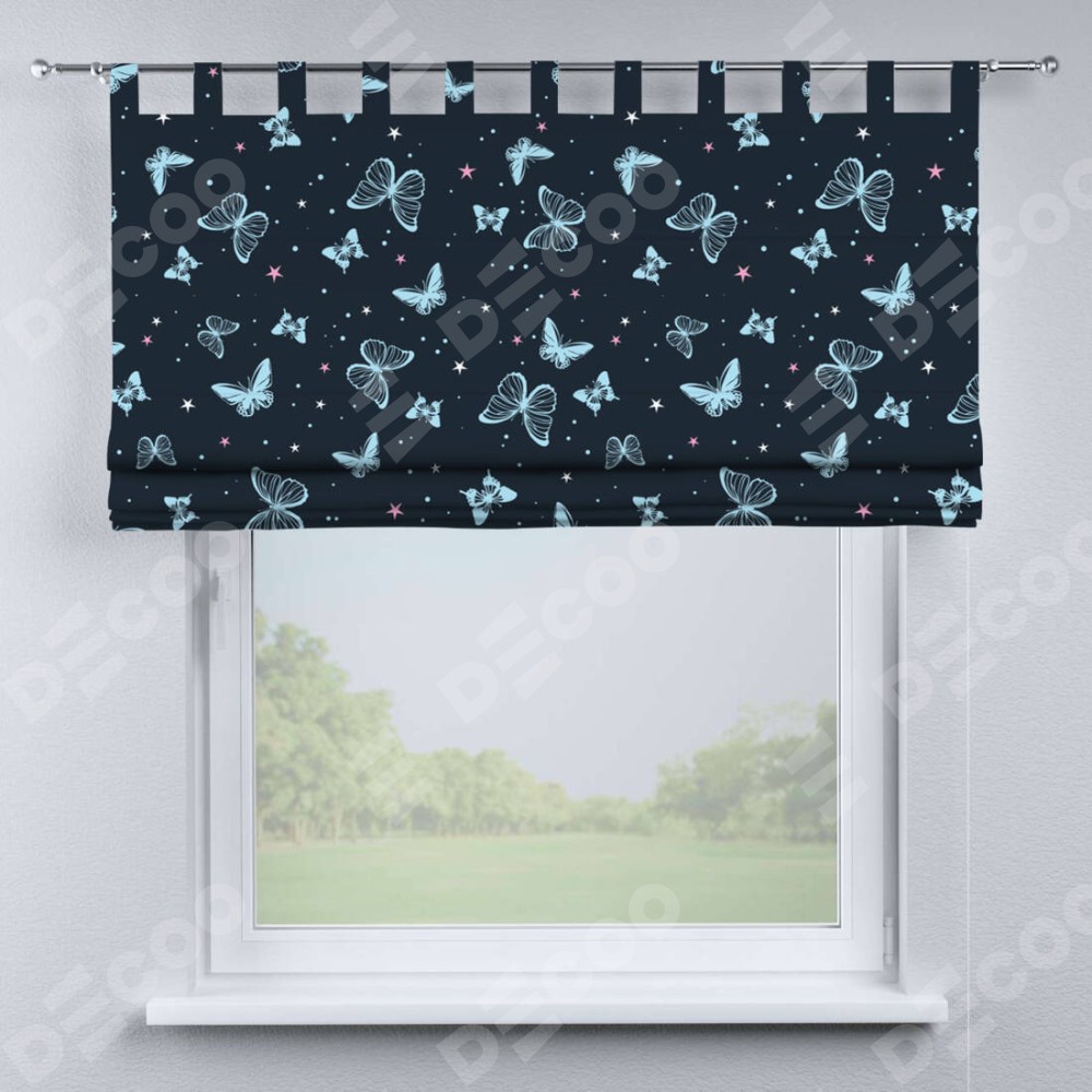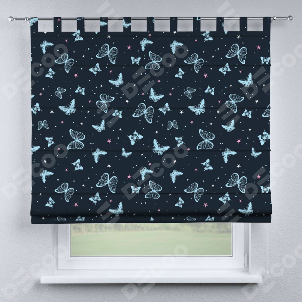 Римская штора производителя «Cortin», используется для проёма, пошита из ткани блэкаут с нанесением сублимационной печати «Неоновые бабочки». Данная модель пошита на петлях, комплектуется на выбор круглым карнизом и подходит для монтажа на стену. Римская штора на петлях имеет простую систему регулировки высоты, отличительным преимуществом данной модели является простой способ монтажа. Достаточно повесить ее на трубу и штора готова!