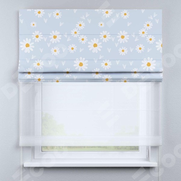 Римская штора день-ночь производителя «Cortin», используется для проёма, пошита из двух полотен, с лицевой блэкаут с нанесением сублимационной печати «Летние ромашки», вторая ткань тюль (по стандарту комплектуется тюль белого цвета артикул V-01). Имеет универсальный механизм и подходит для монтажа: на потолок, на стену и в нишу.