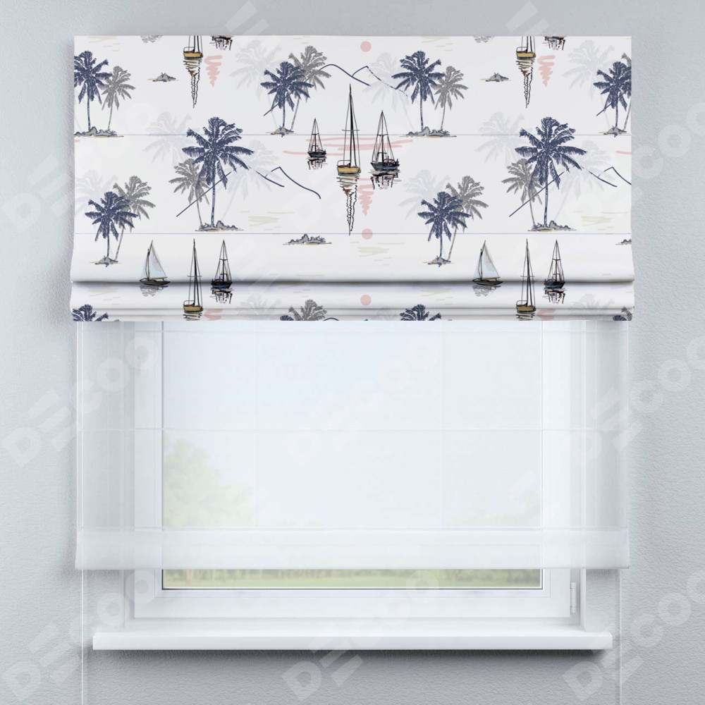 Римская штора день-ночь производителя «Cortin», используется для проёма, пошита из двух полотен, с лицевой блэкаут с нанесением сублимационной печати «Морское путешествие», вторая ткань тюль (по стандарту комплектуется тюль белого цвета артикул V-01). Имеет универсальный механизм и подходит для монтажа: на потолок, на стену и в нишу.