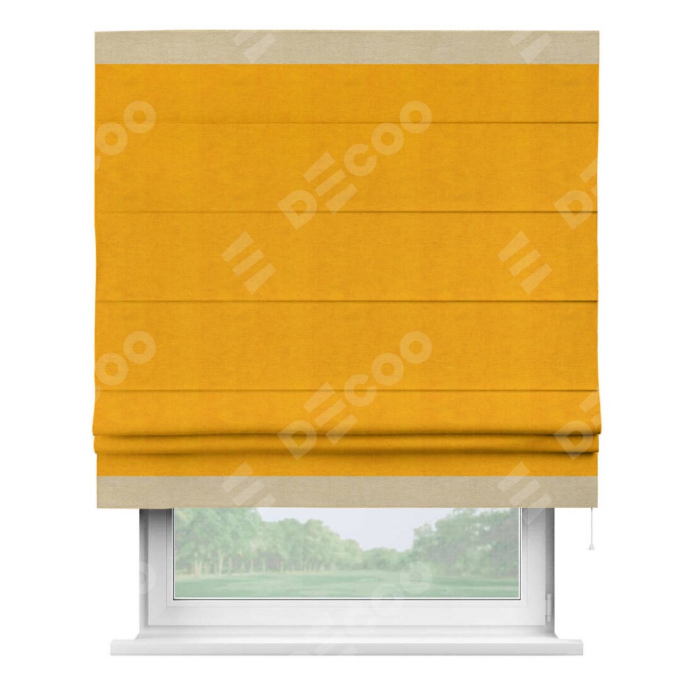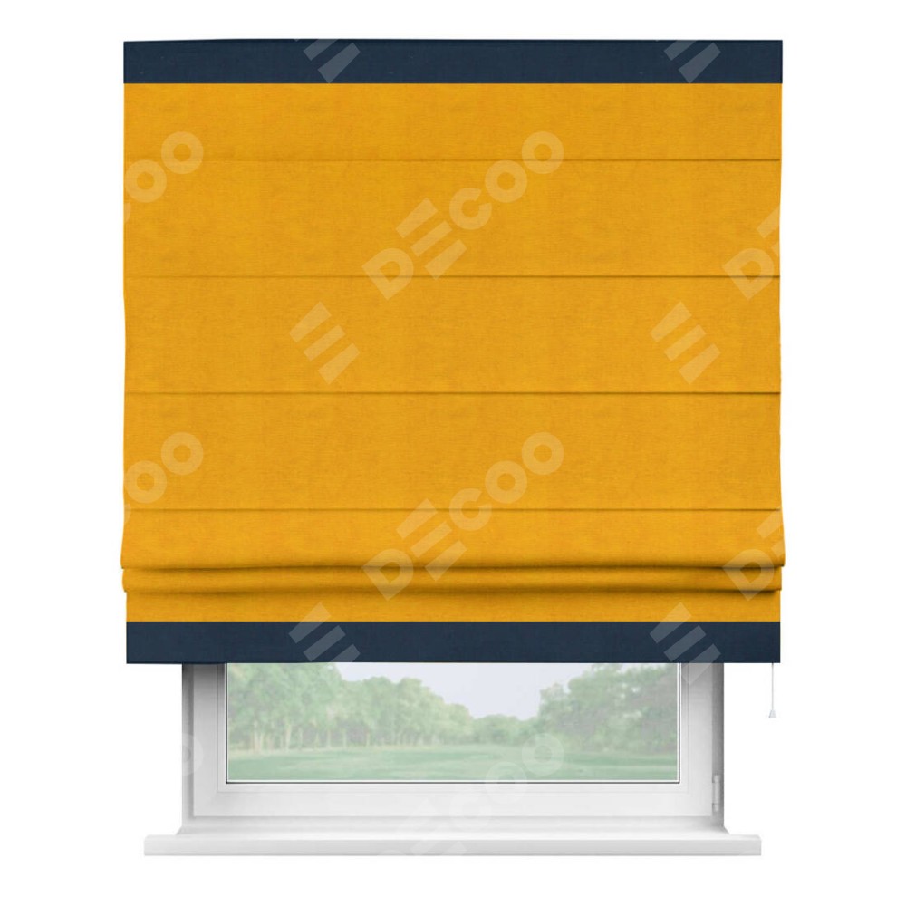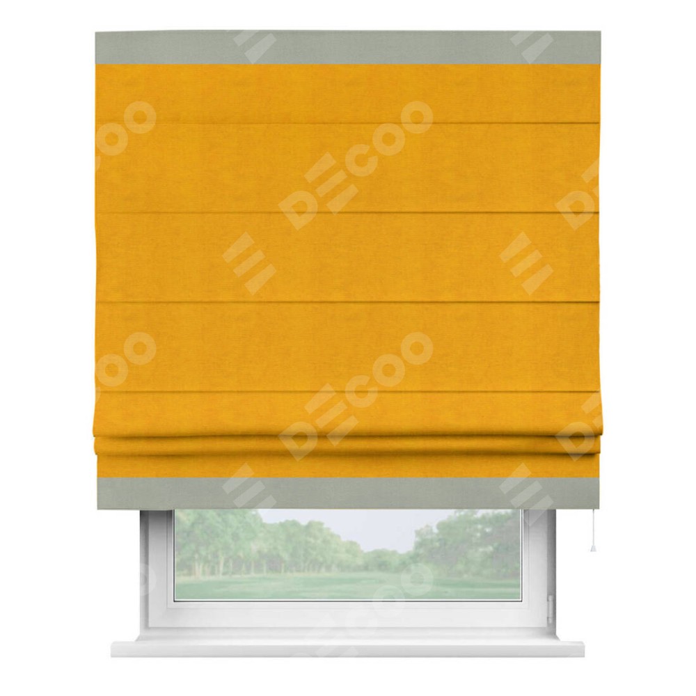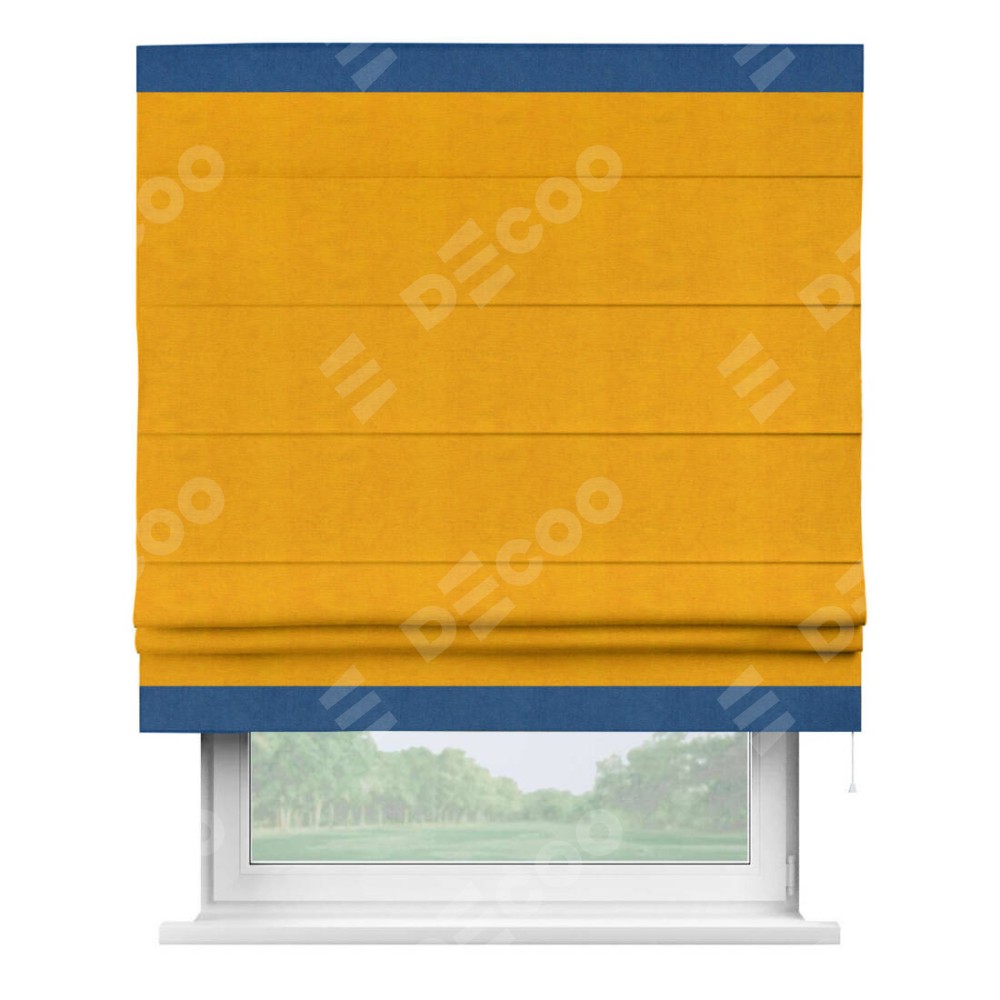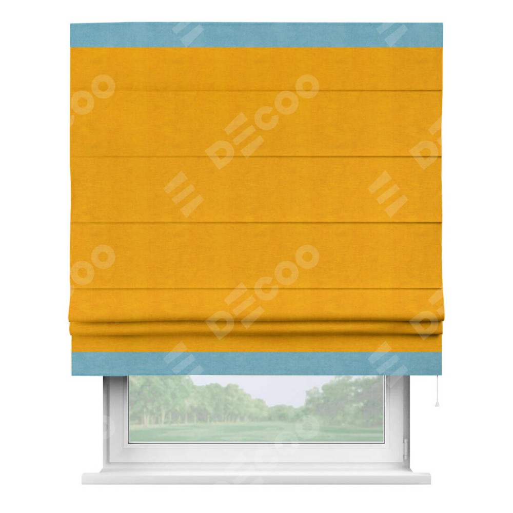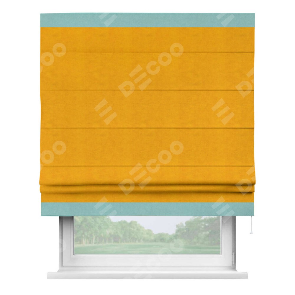 Римская штора производителя «Cortin», используется для проёма, пошита из ткани вельвет желтый, артикул ткани 85547. Отделка шторы кантом «Горизонт», ткань для канта используется из вельвета разной расцветки на выбор. Имеет универсальный механизм и подходит для монтажа: на потолок, на стену и в нишу.