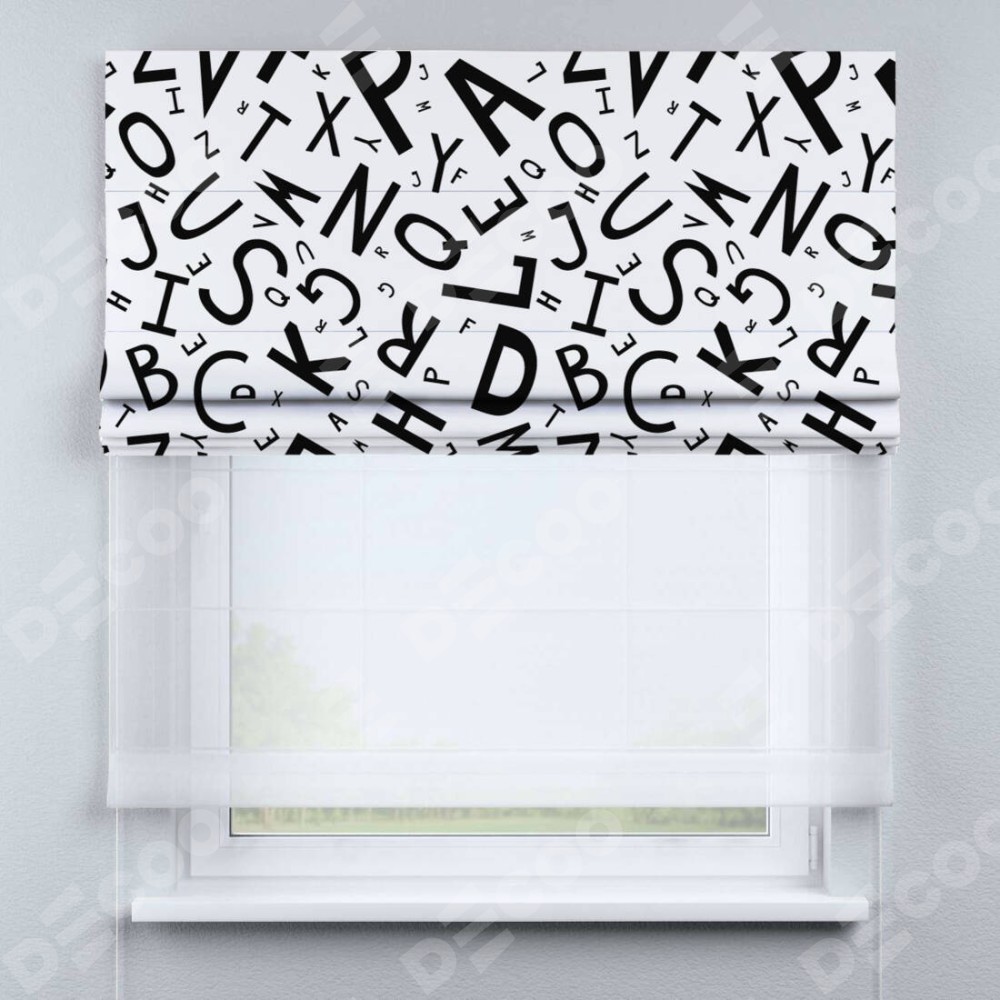 Римская штора день-ночь производителя «Cortin», используется для проёма, пошита из двух полотен, с лицевой блэкаут с нанесением сублимационной печати «Литеры на белом», вторая ткань тюль (по стандарту комплектуется тюль белого цвета артикул V-01). Имеет универсальный механизм и подходит для монтажа: на потолок, на стену и в нишу.