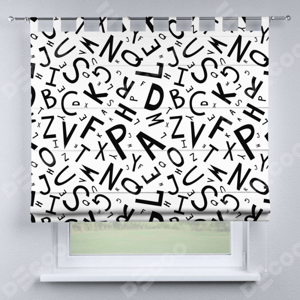 Римская штора производителя «Cortin», используется для проёма, пошита из ткани блэкаут с нанесением сублимационной печати «Литеры на белом». Данная модель пошита на петлях, комплектуется на выбор круглым карнизом и подходит для монтажа на стену. Римская штора на петлях имеет простую систему регулировки высоты, отличительным преимуществом данной модели является простой способ монтажа. Достаточно повесить ее на трубу и штора готова!
