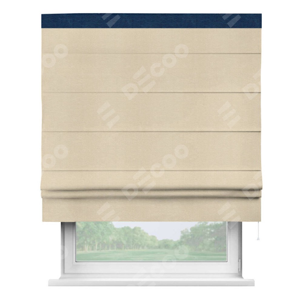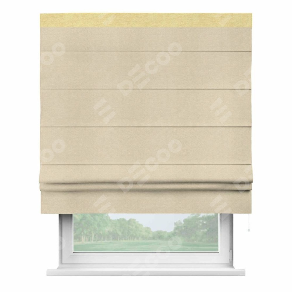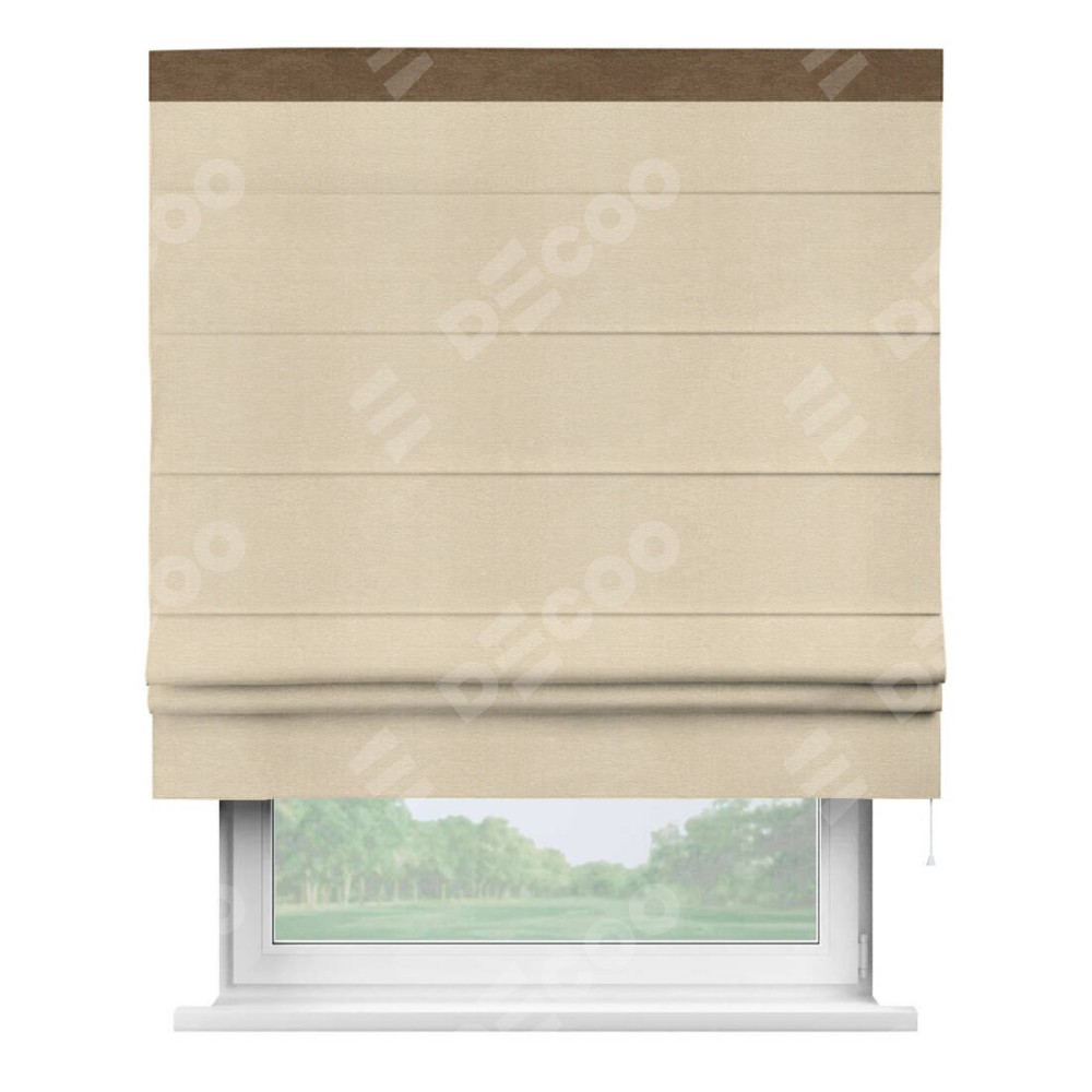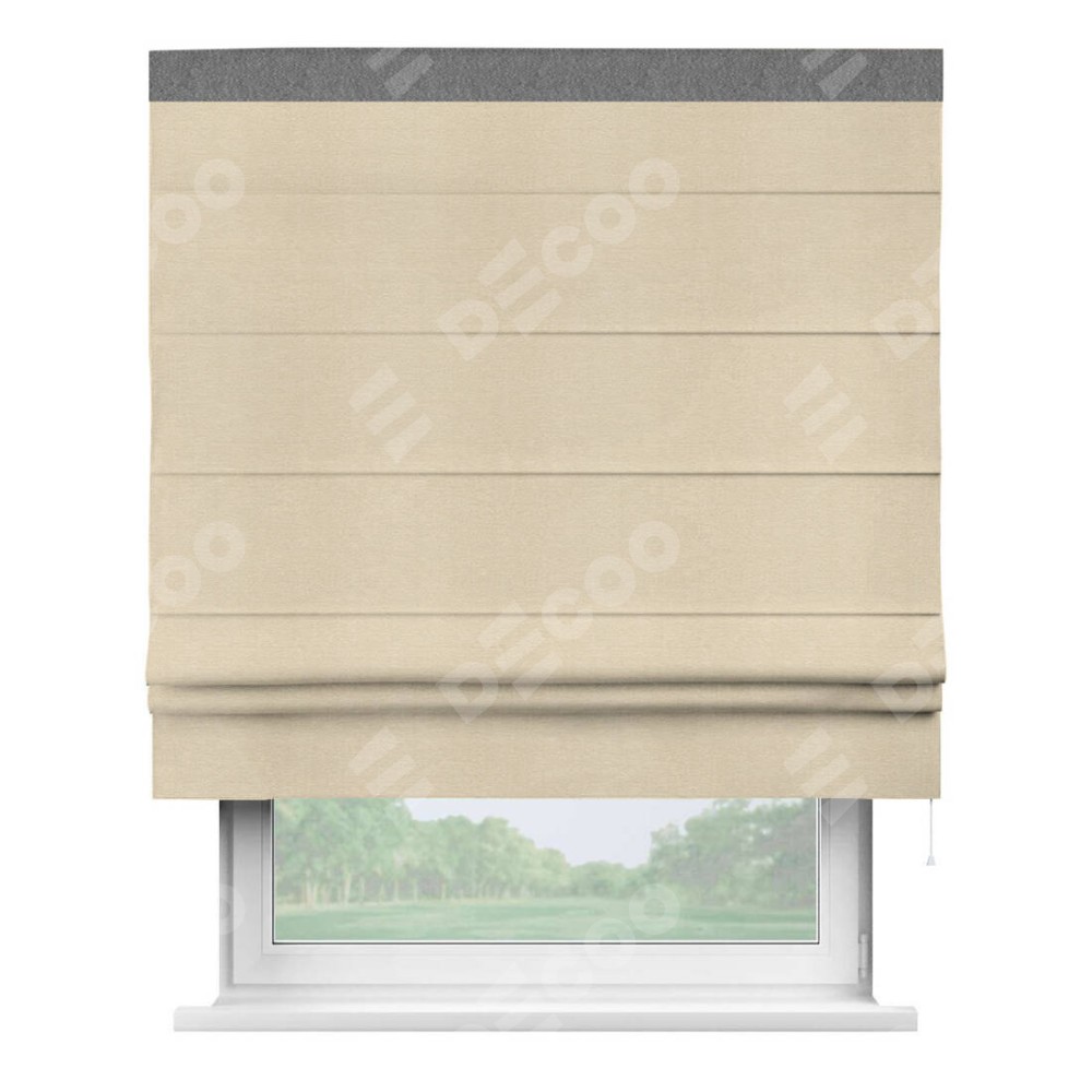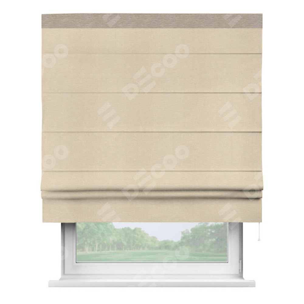 Римская штора производителя «Cortin», используется для проёма, пошита из ткани софт однотонный бежевый лайт, артикул 33100. Отделка шторы кантом «Кинг», ткань для канта используется из софта разной расцветки на выбор. Имеет универсальный механизм и подходит для монтажа: на потолок, на стену и в нишу.