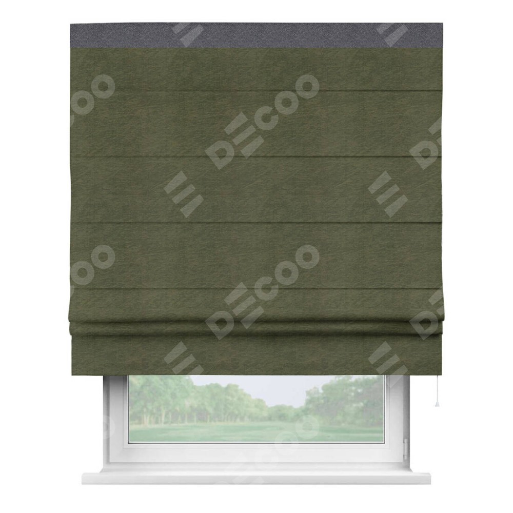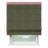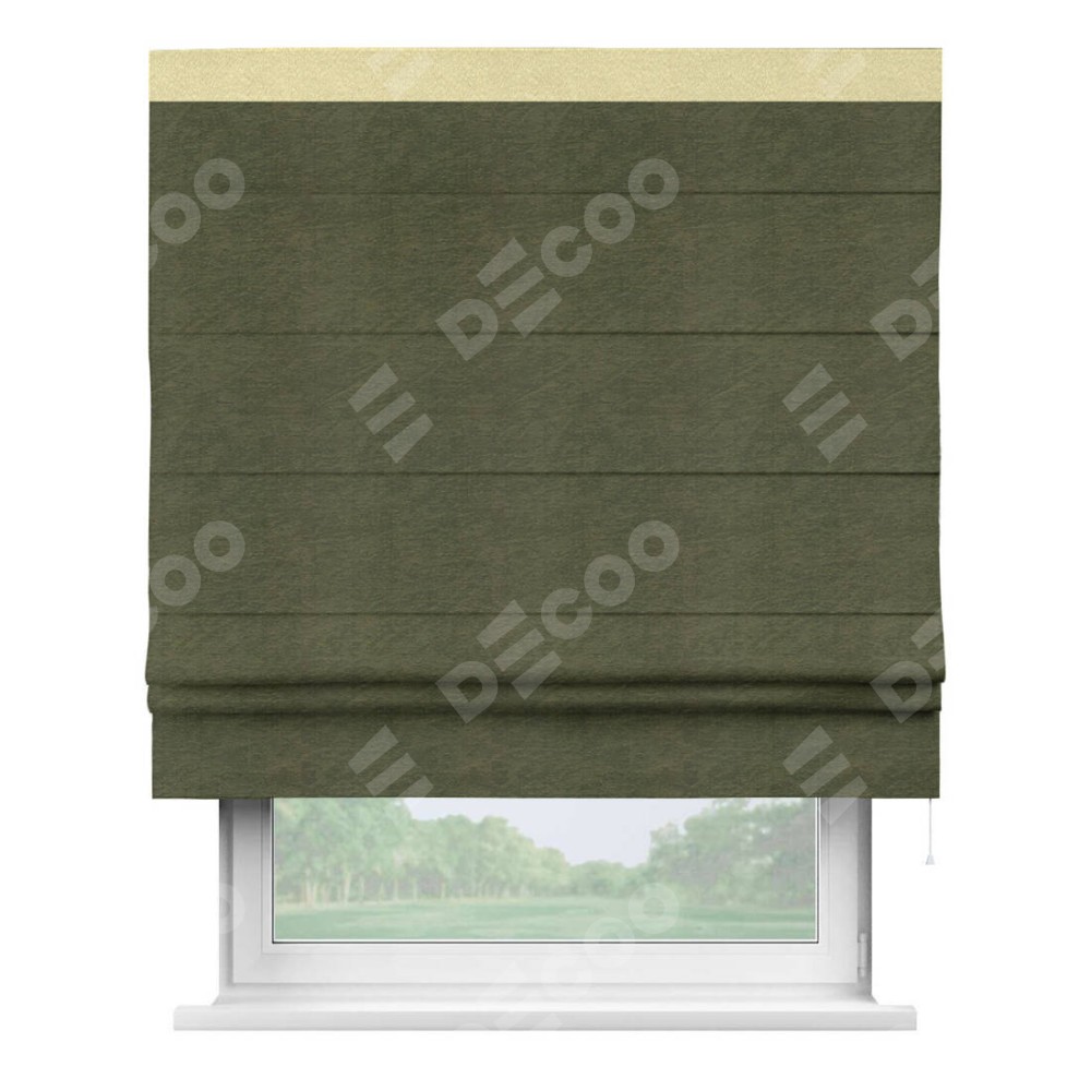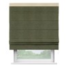 Римская штора производителя «Cortin», используется для проёма, пошита из ткани софт однотонный зелёный, артикул 33110. Отделка шторы кантом «Кинг», ткань для канта используется из софта разной расцветки на выбор. Имеет универсальный механизм и подходит для монтажа: на потолок, на стену и в нишу.