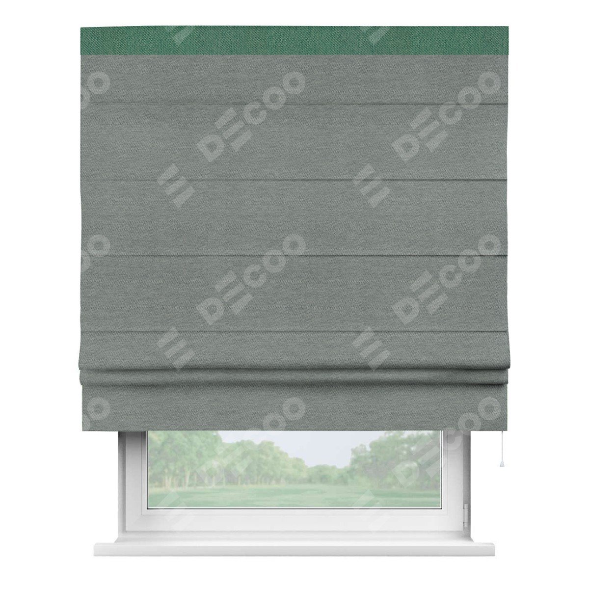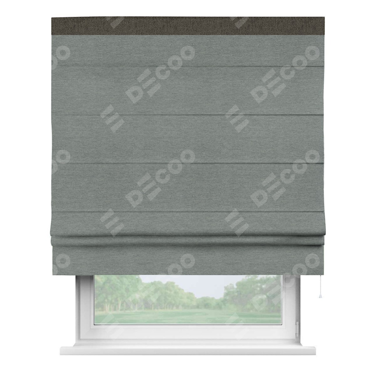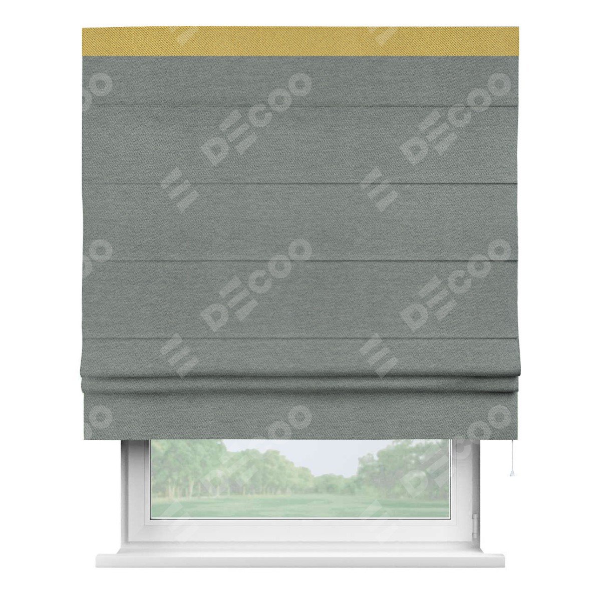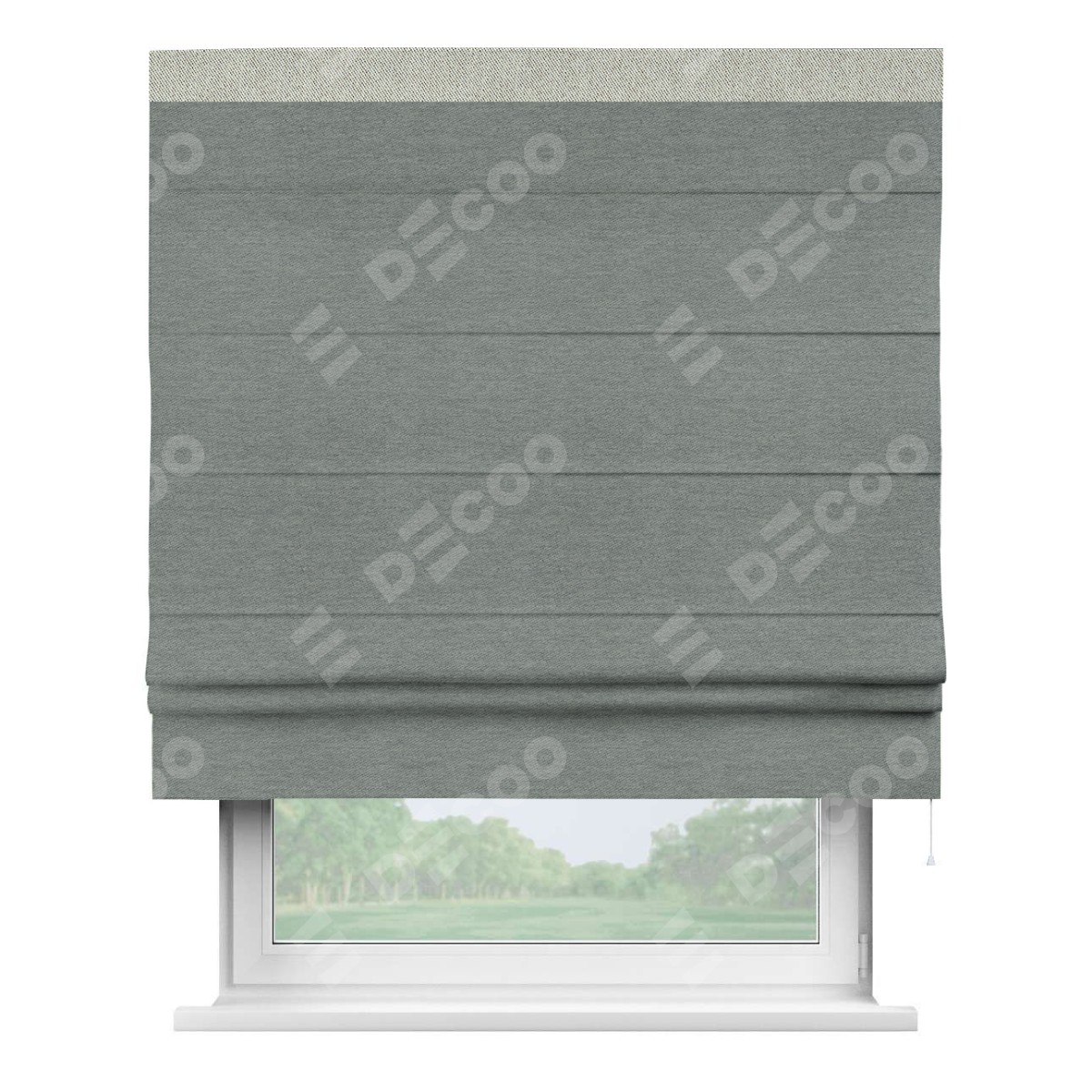 Римская штора производителя «Cortin», используется для проёма, пошита из ткани твид блэкаут серый, артикул 21577. Отделка шторы кантом «Кинг», ткань для канта используется из твида разной расцветки на выбор. Имеет универсальный механизм и подходит для монтажа: на потолок, на стену и в нишу.
