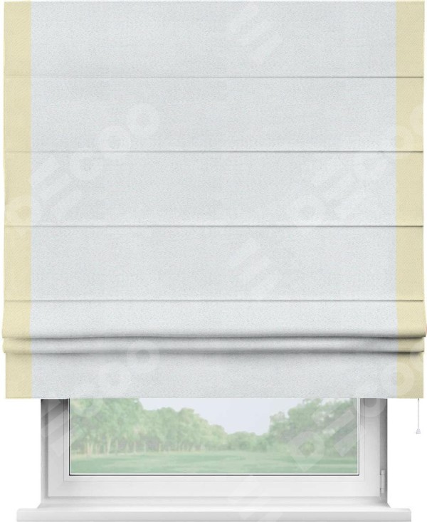 Римская штора производителя «Cortin», используется для проёма, пошита из ткани блэкаут однотонный дымчато-белый, артикул ткани 101. Отделка шторы кантом «Стрим Дуо», ткань для канта используется из блэкаута однотонного разной расцветки на выбор. Имеет универсальный механизм и подходит для монтажа: на потолок, на стену и в нишу.