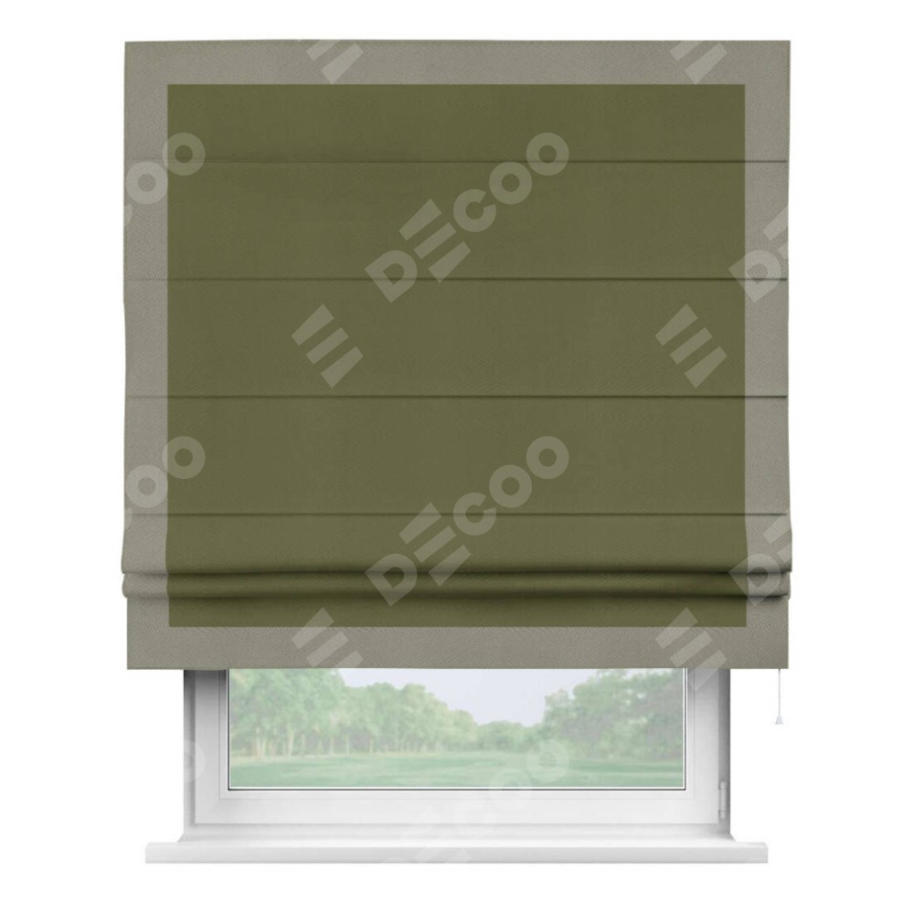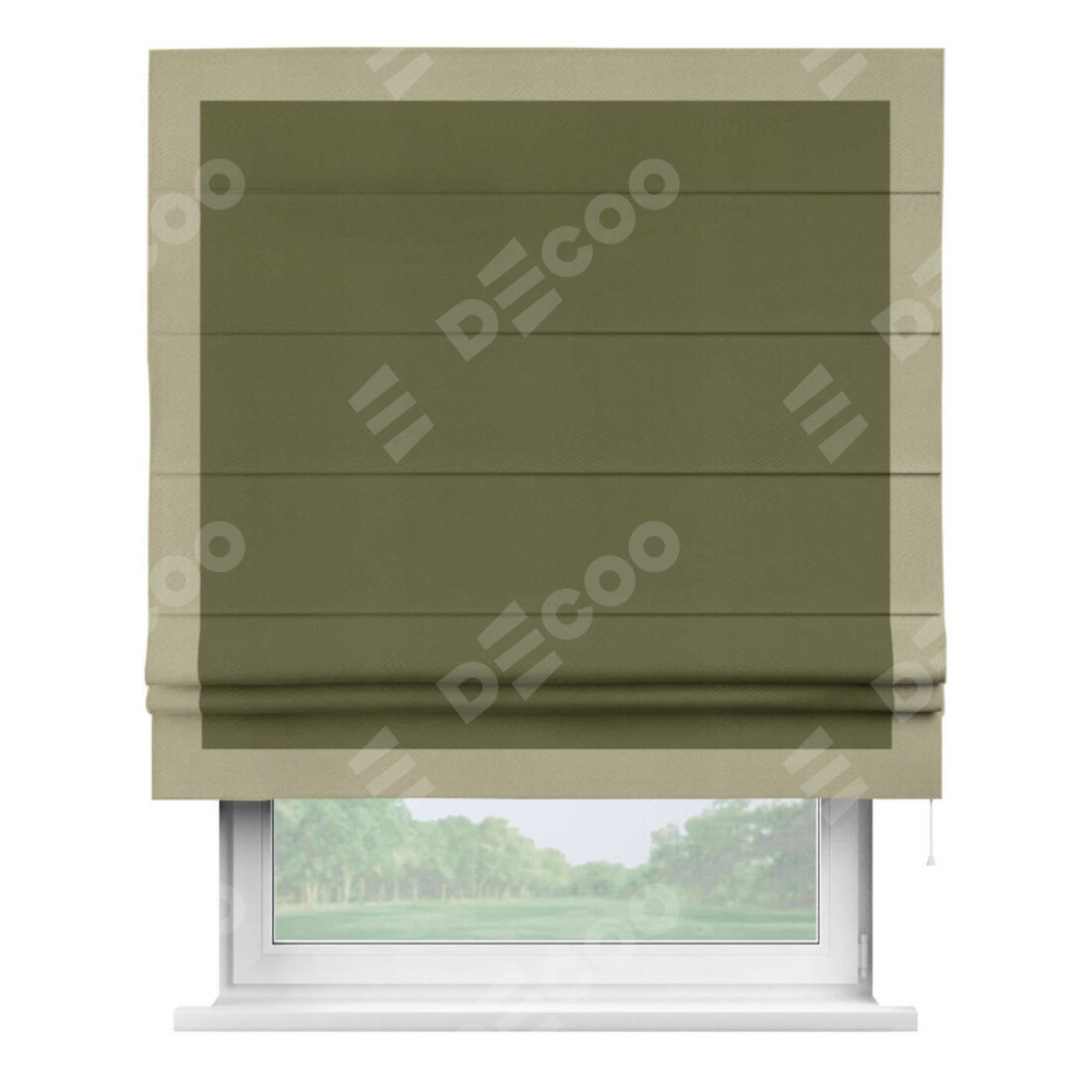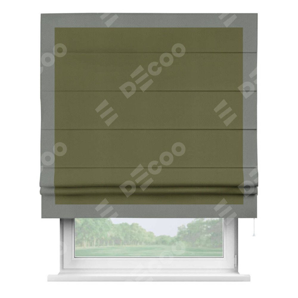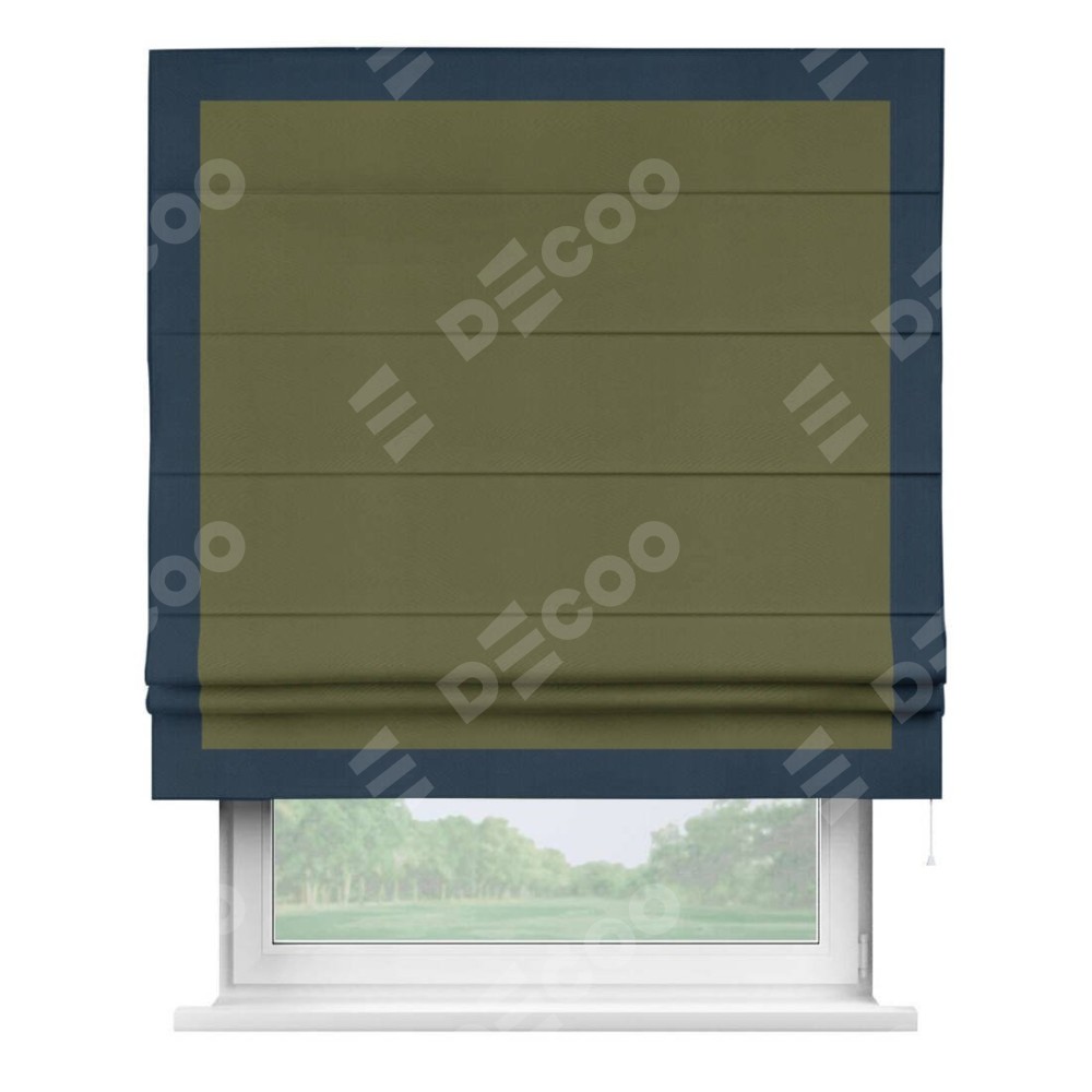 Римская штора производителя «Cortin», используется для проёма, пошита из ткани блэкаут однотонный зелёный, артикул ткани 81859. Отделка шторы кантом «Чесс», ткань для канта используется из блэкаута однотонного разной расцветки на выбор. Имеет универсальный механизм и подходит для монтажа: на потолок, на стену и в нишу.