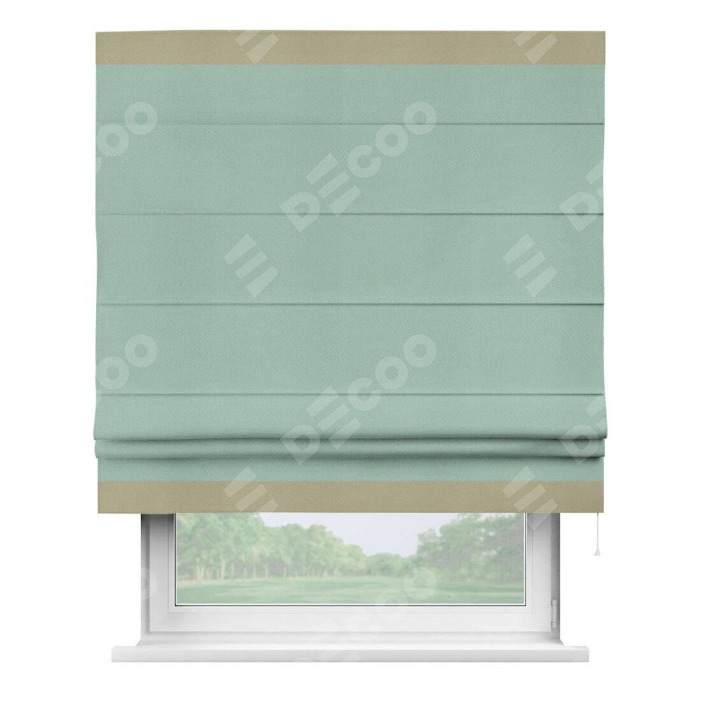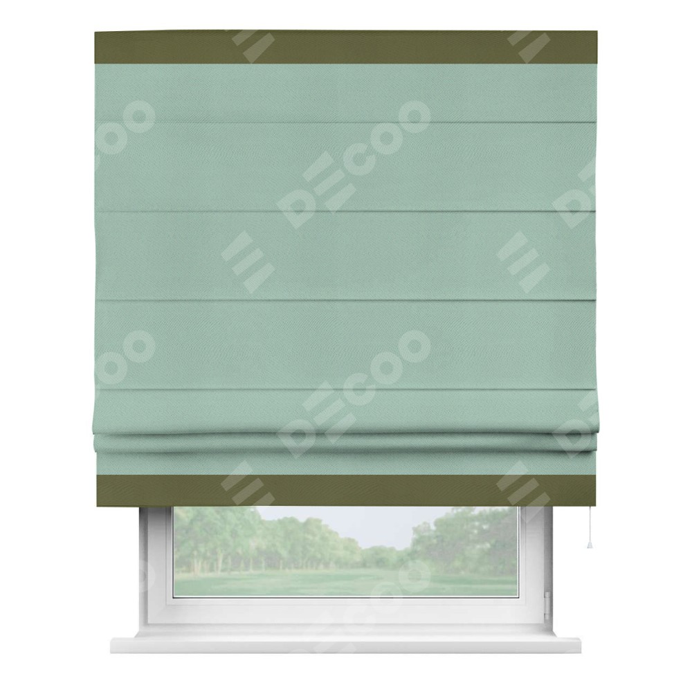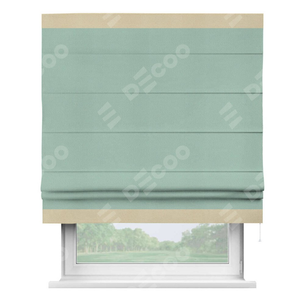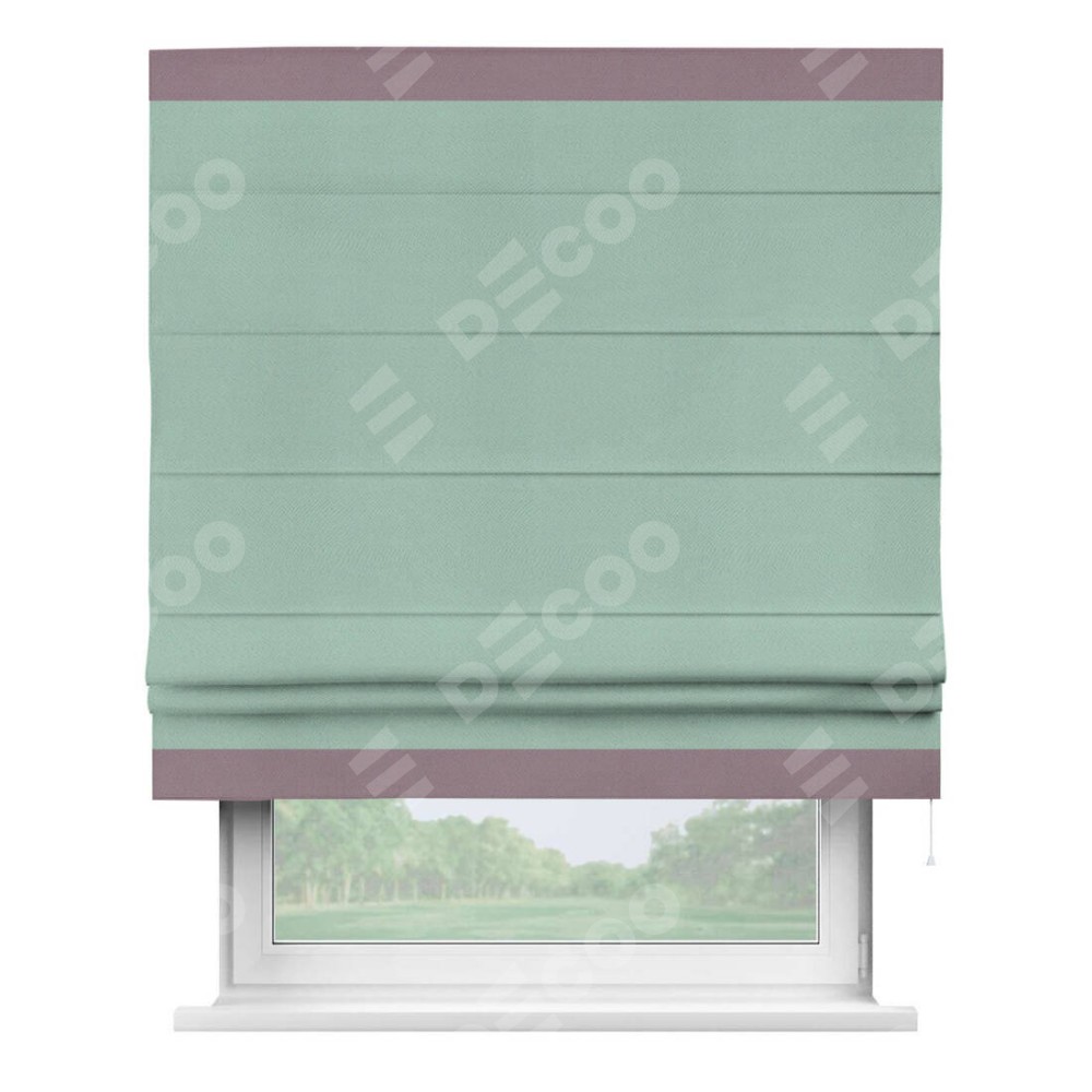 Римская штора производителя «Cortin», используется для проёма, пошита из ткани блэкаут однотонный ментоловый, артикул ткани 29584. Отделка шторы кантом «Горизонт», ткань для канта используется из блэкаута однотонного разной расцветки на выбор. Имеет универсальный механизм и подходит для монтажа: на потолок, на стену и в нишу.