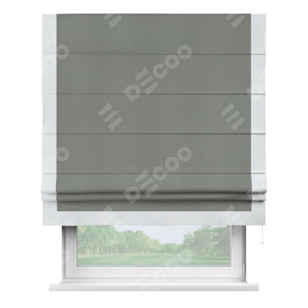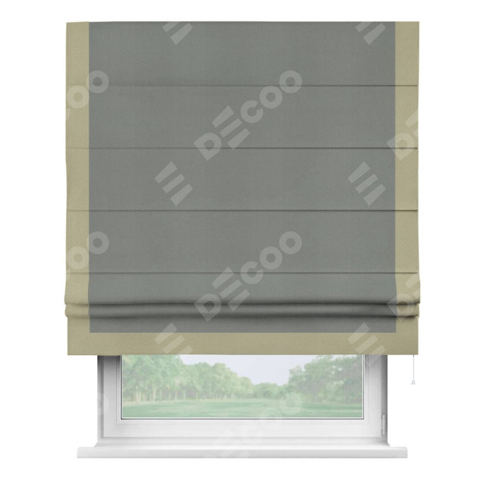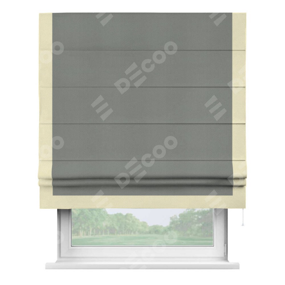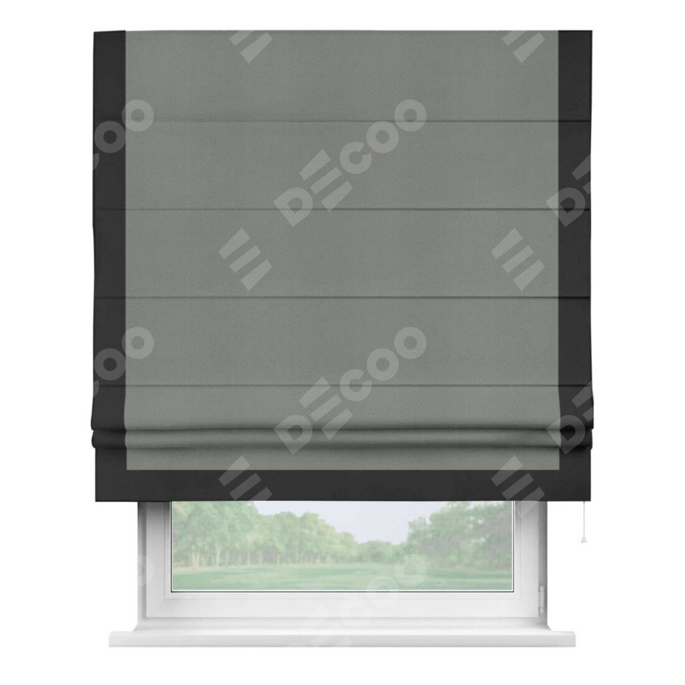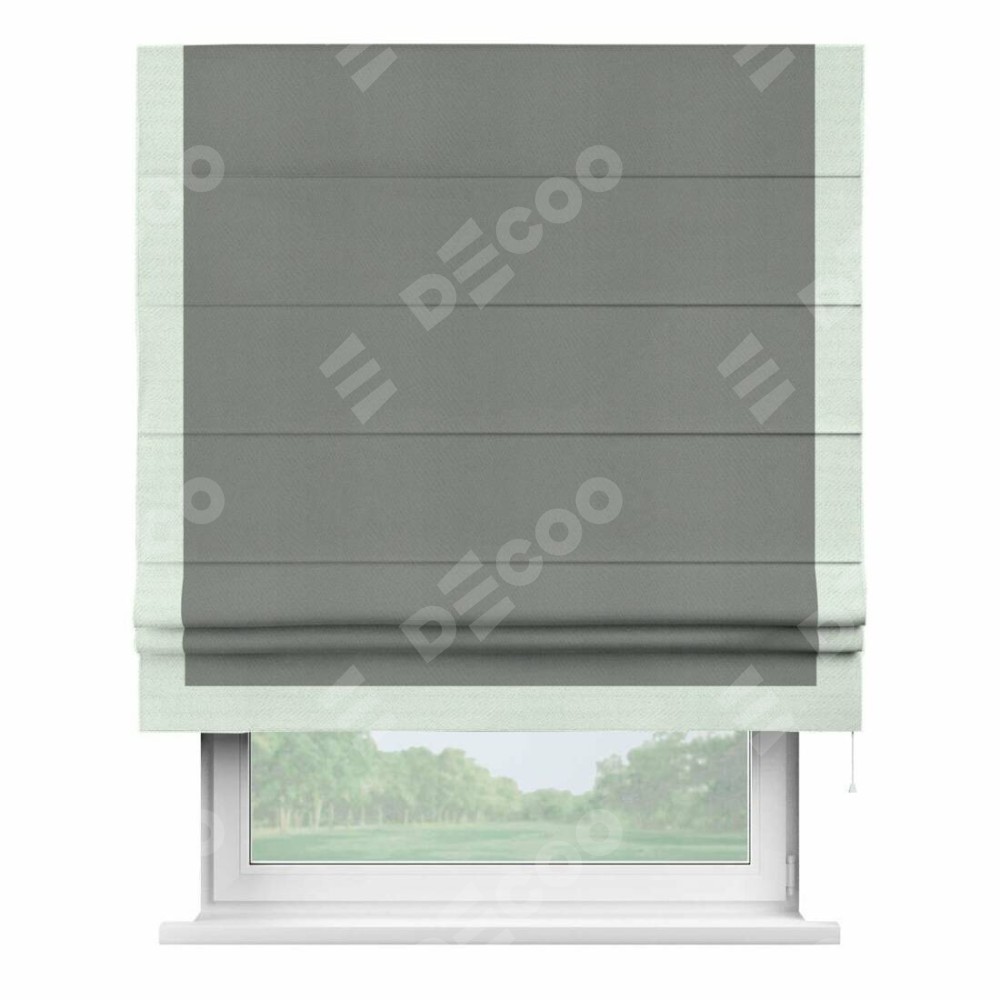Римская штора производителя «Cortin», используется для проёма, пошита из ткани блэкаут однотонный тёмно-серый, артикул ткани 18077. Отделка шторы кантом «Виктория», ткань для канта используется из блэкаута однотонного разной расцветки на выбор. Имеет универсальный механизм и подходит для монтажа: на потолок, на стену и в нишу.
