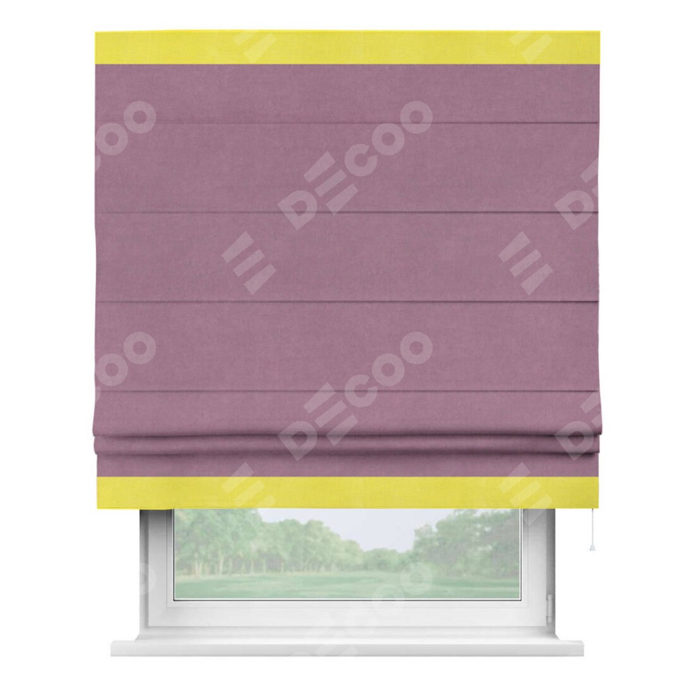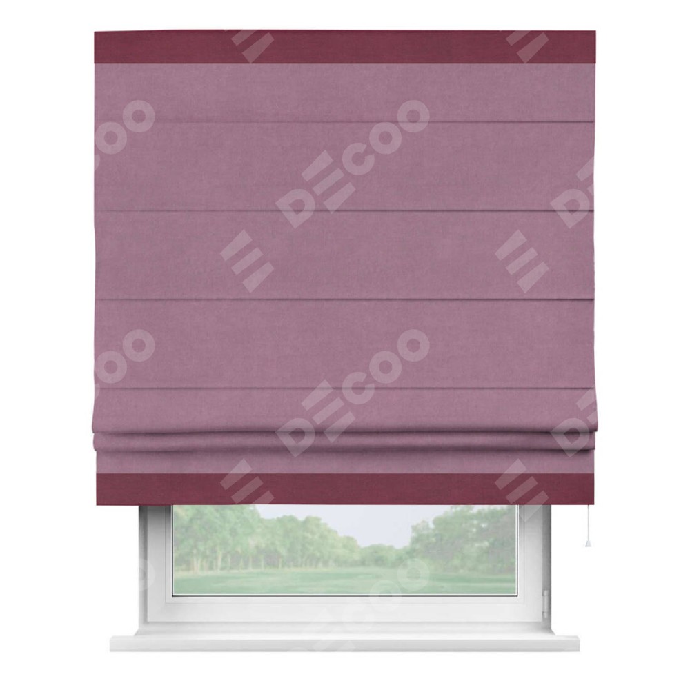 Римская штора производителя «Cortin», используется для проёма, пошита из ткани вельвет лиловый, артикул ткани 17752. Отделка шторы кантом «Горизонт», ткань для канта используется из вельвета разной расцветки на выбор. Имеет универсальный механизм и подходит для монтажа: на потолок, на стену и в нишу.