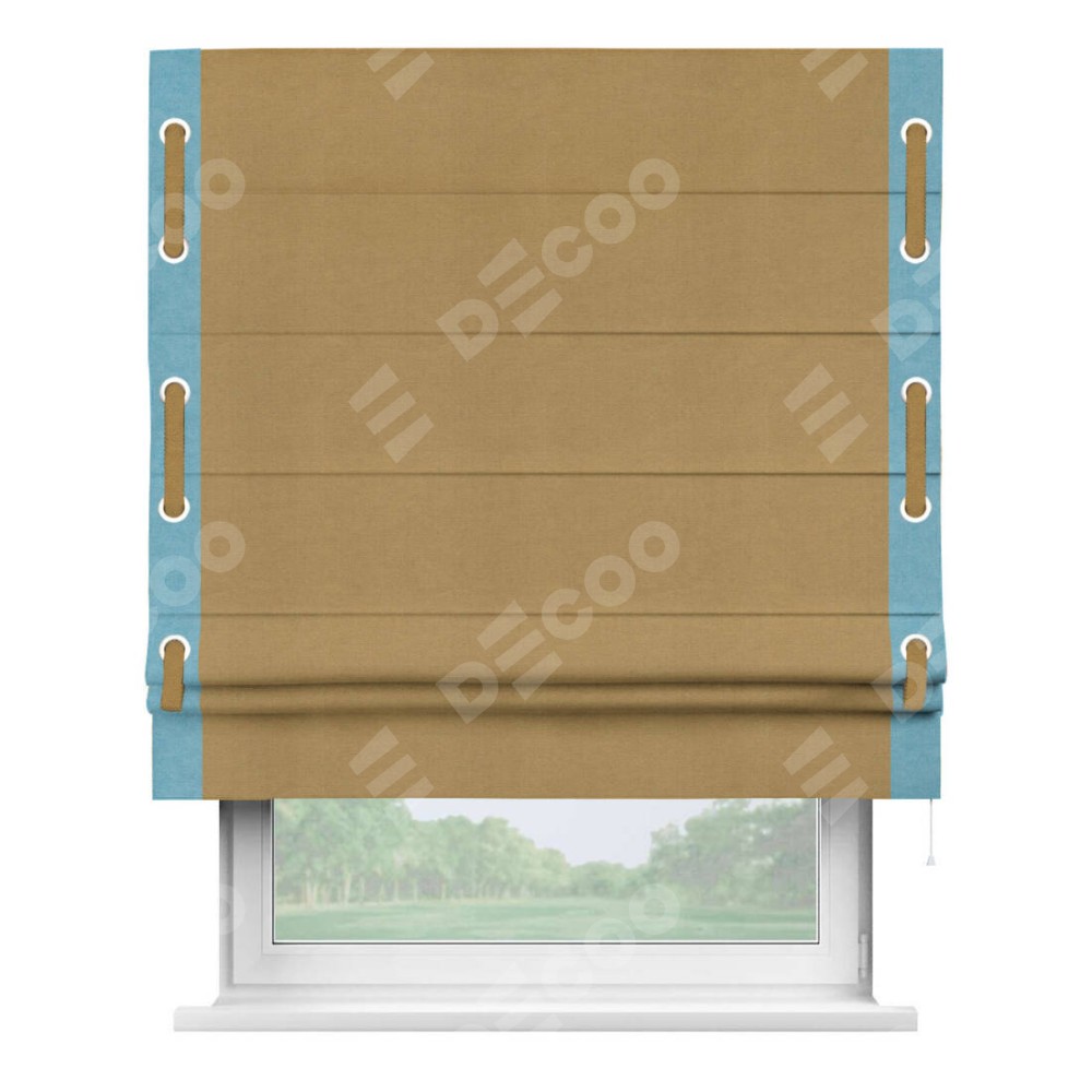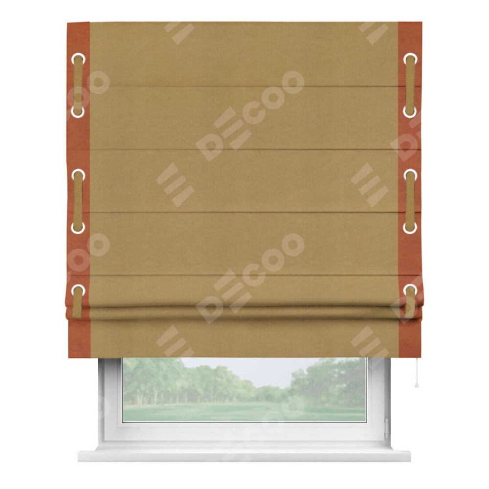 Римская штора производителя «Cortin», используется для проёма, пошита из ткани вельвет горчица, артикул ткани 17760. Отделка шторы кантом «Стрим Дуо» на кантах расположены люверсы с пояском, ткань для канта используется из вельвета разной расцветки на выбор. Ткань для пояска обычно используется из основной ткани шторы, а так же можно сделать из любой расцветки по желанию. Имеет универсальный механизм и подходит для монтажа: на потолок, на стену и в нишу.