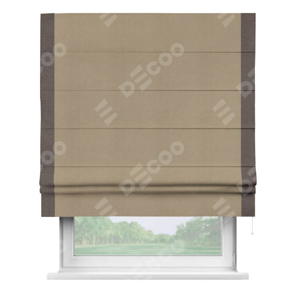 Римская штора производителя «Cortin», используется для проёма, пошита из ткани вельвет кофейный, артикул ткани 30980. Отделка шторы кантом «Стрим Дуо», ткань для канта используется из вельвета разной расцветки на выбор. Имеет универсальный механизм и подходит для монтажа: на потолок, на стену и в нишу.