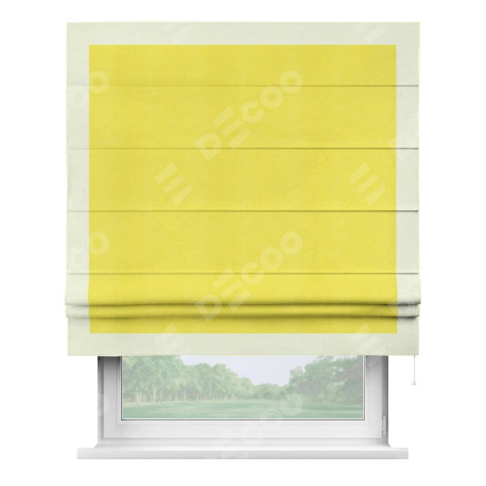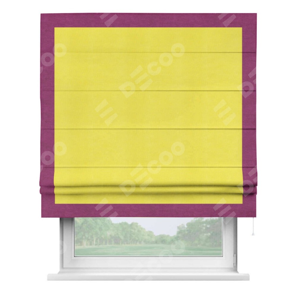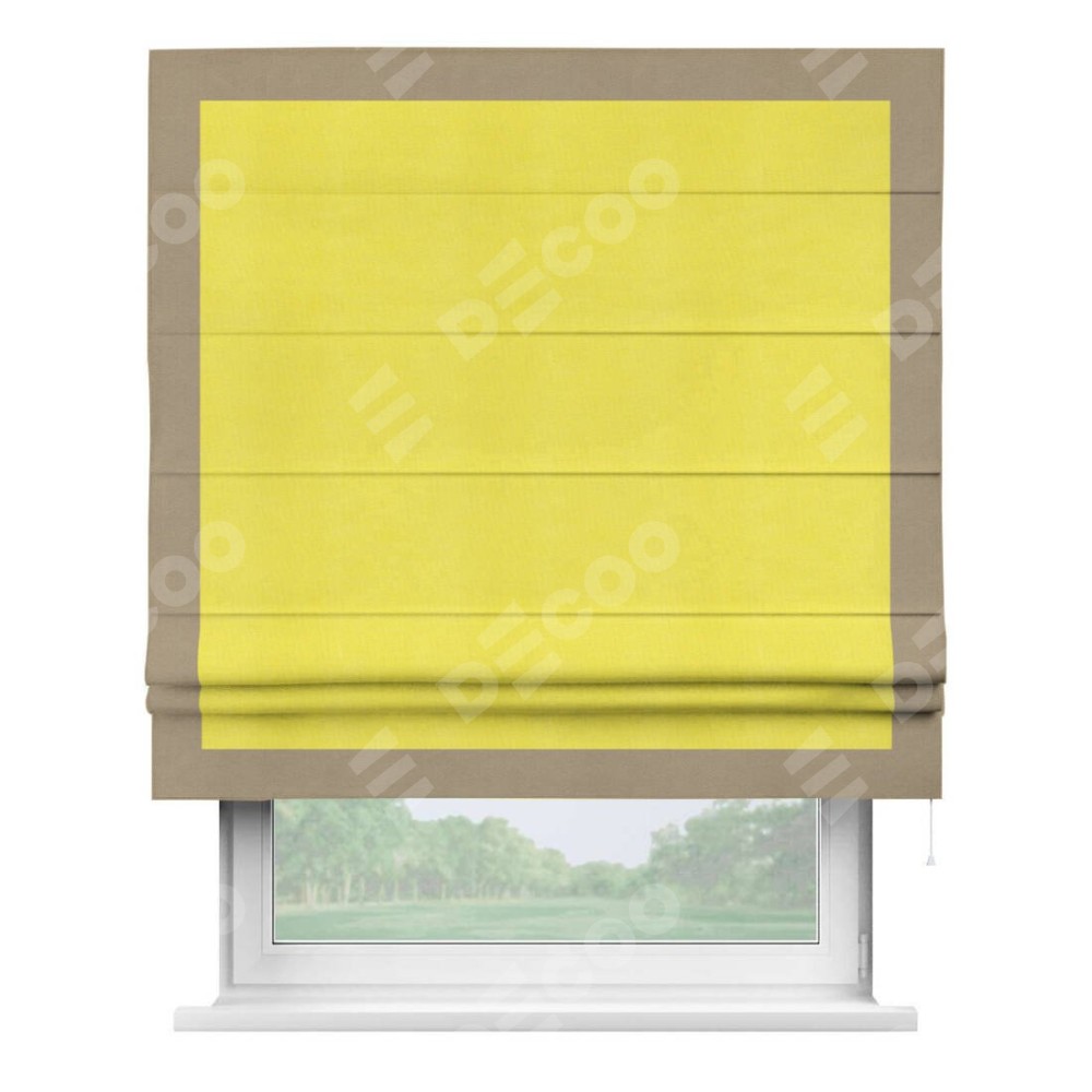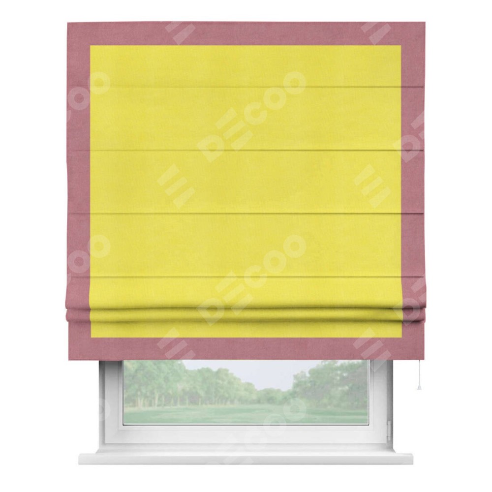 Римская штора производителя «Cortin», используется для проёма, пошита из ткани вельвет cветло-желтый, артикул ткани 30997. Отделка шторы кантом «Чесс», ткань для канта используется из вельвета разной расцветки на выбор. Имеет универсальный механизм и подходит для монтажа: на потолок, на стену и в нишу.
