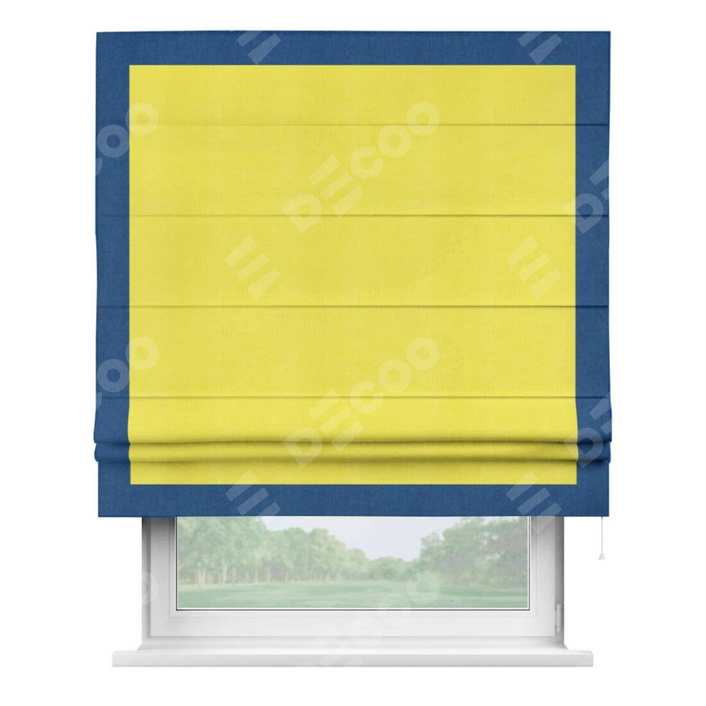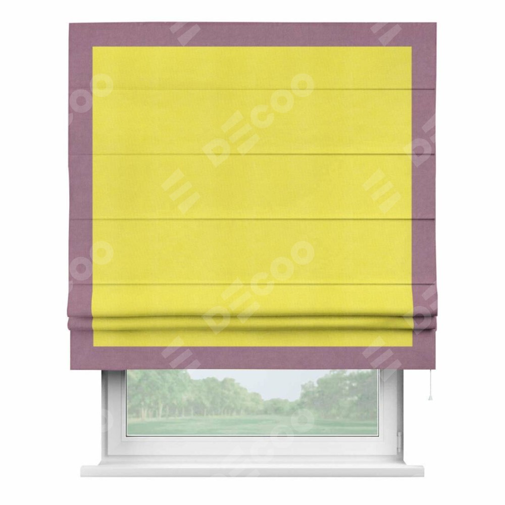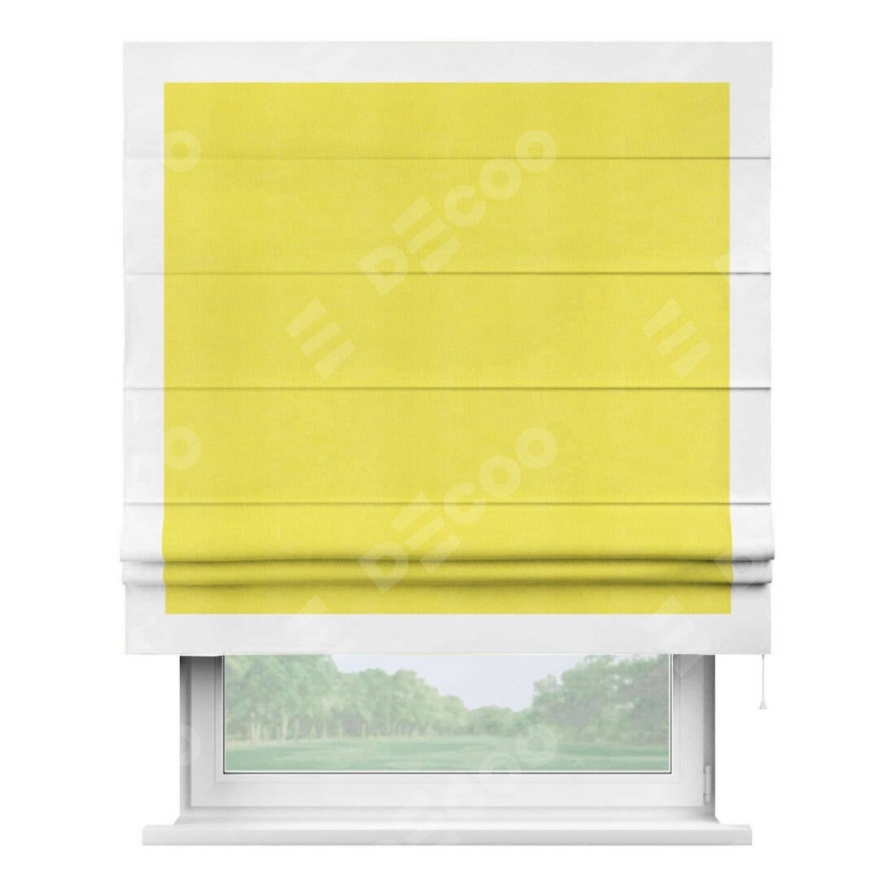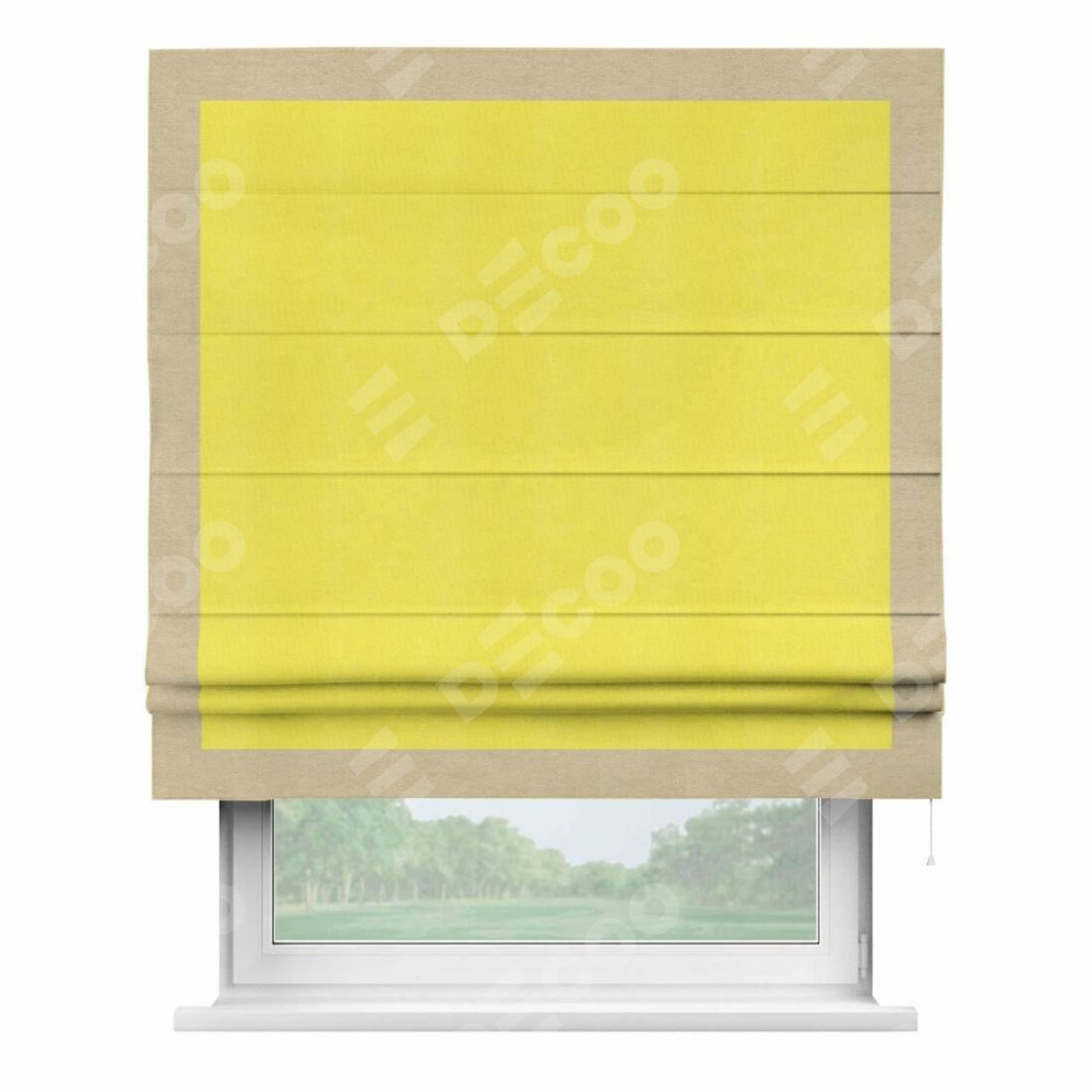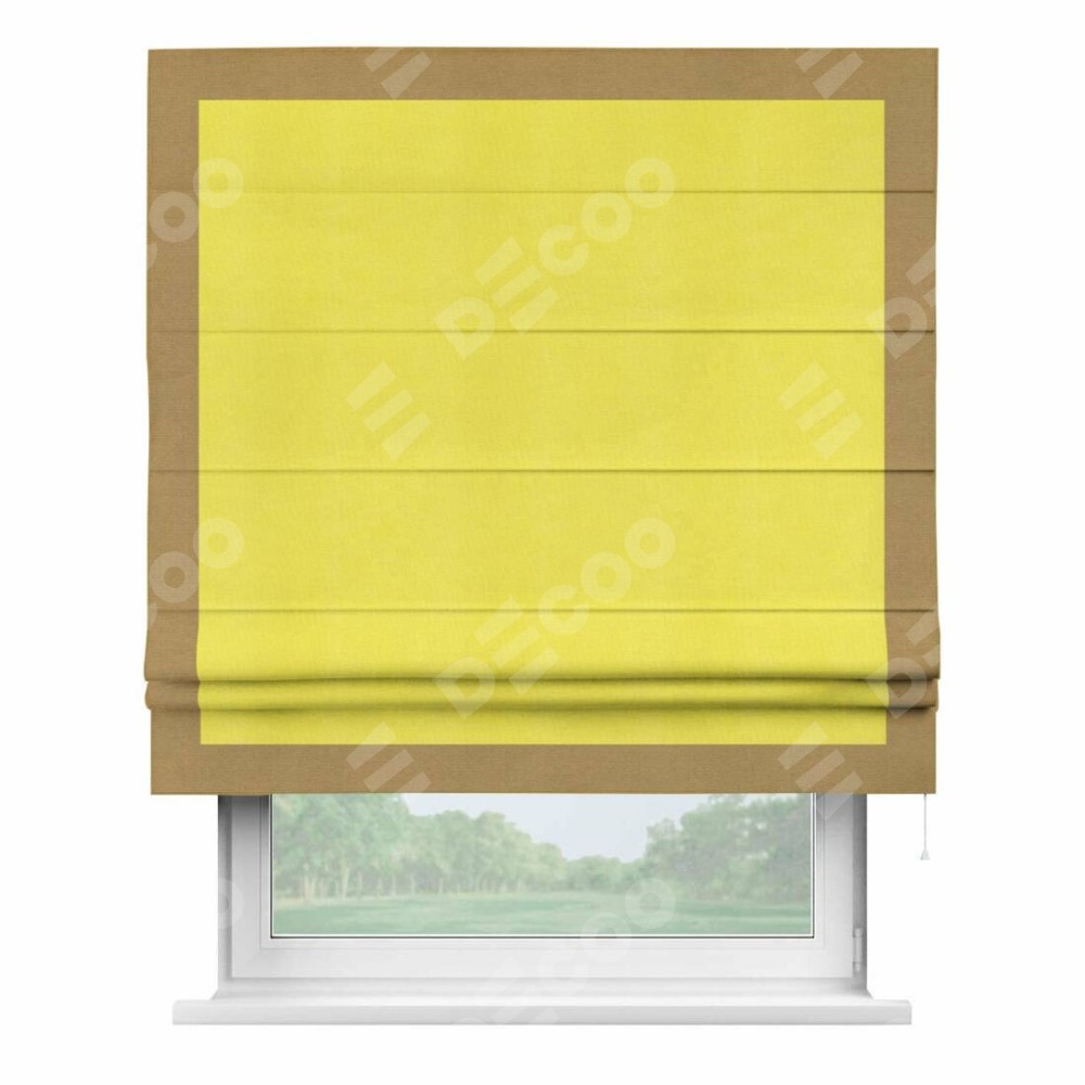 Римская штора производителя «Cortin», используется для проёма, пошита из ткани вельвет cветло-желтый, артикул ткани 30997. Отделка шторы кантом «Чесс», ткань для канта используется из вельвета разной расцветки на выбор. Имеет универсальный механизм и подходит для монтажа: на потолок, на стену и в нишу.