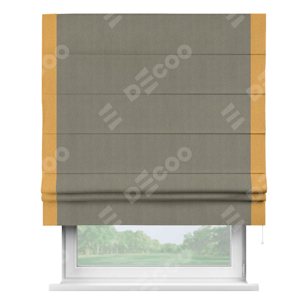Римская штора производителя «Cortin», используется для проёма, пошита из ткани блэкаут с блеском графитовый, артикул 34648. Отделка шторы кантом «Стрим Дуо», ткань для канта используется из блэкаута с блеском разной расцветки на выбор. Изнаночная сторона материала черного цвета, что обеспечивает необходимую светонепроницаемость. Имеет универсальный механизм и подходит для монтажа: на потолок, на стену и в нишу.