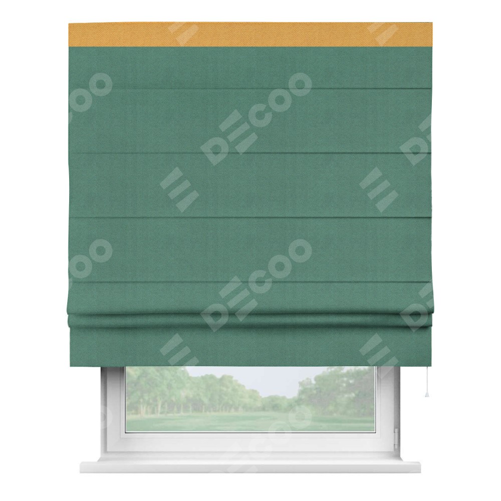Римская штора производителя «Cortin», используется для проёма, пошита из ткани блэкаут с блеском изумрудный, артикул 34628. Отделка шторы кантом «Кинг», ткань для канта используется из блэкаута с блеском разной расцветки на выбор. Изнаночная сторона материала черного цвета, что обеспечивает необходимую светонепроницаемость. Имеет универсальный механизм и подходит для монтажа: на потолок, на стену и в нишу.