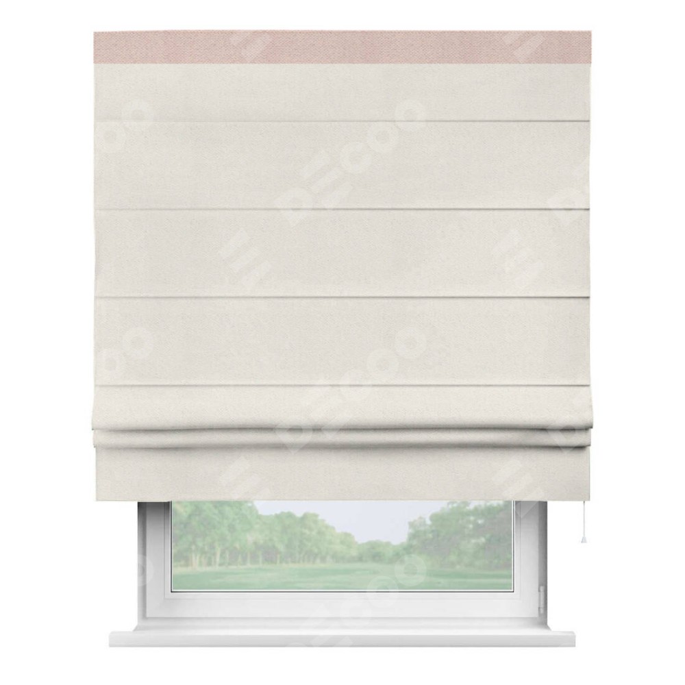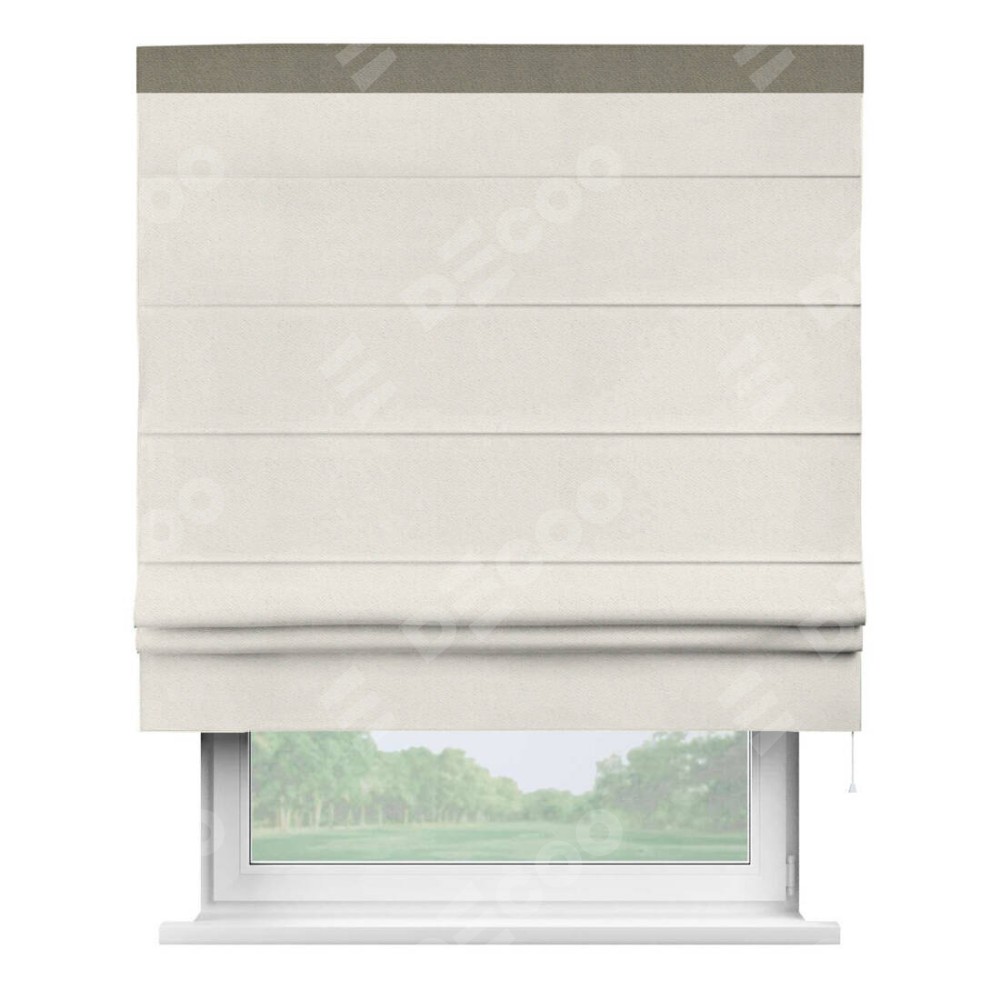 Римская штора производителя «Cortin», используется для проёма, пошита из ткани блэкаут с блеском светло-серый, артикул 34633. Отделка шторы кантом «Кинг», ткань для канта используется из блэкаута с блеском разной расцветки на выбор. Изнаночная сторона материала черного цвета, что обеспечивает необходимую светонепроницаемость. Имеет универсальный механизм и подходит для монтажа: на потолок, на стену и в нишу.