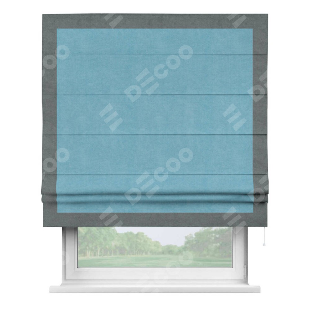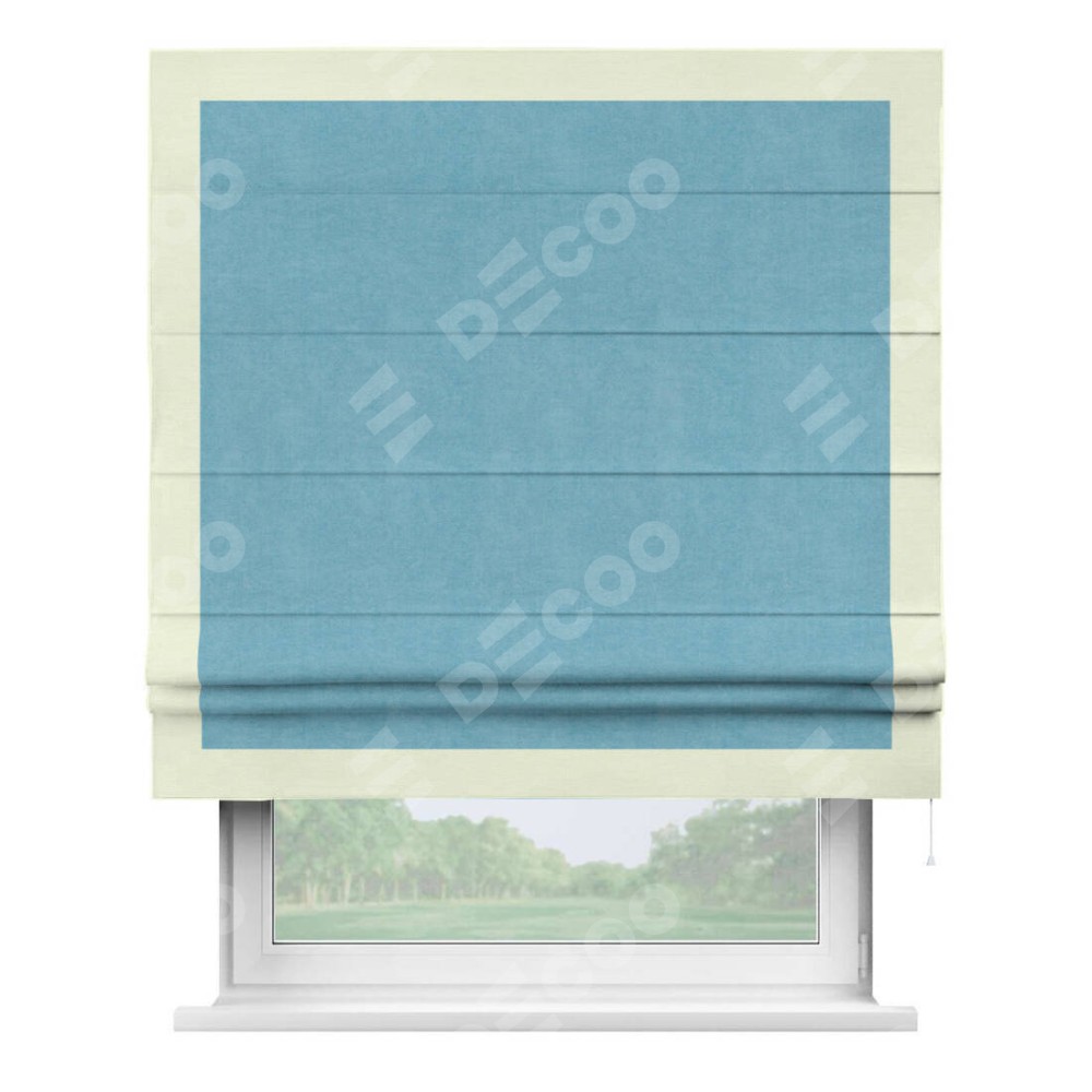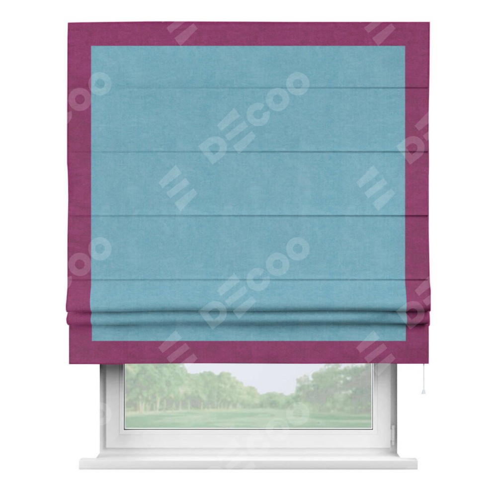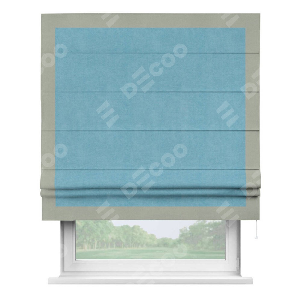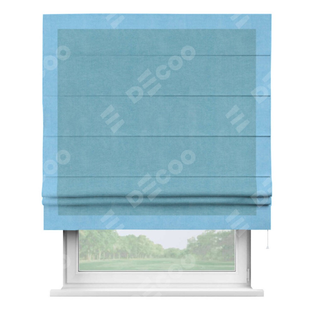 Римская штора производителя «Cortin», используется для проёма, пошита из ткани вельвет ментоловый, артикул ткани 10443. Отделка шторы кантом «Чесс», ткань для канта используется из вельвета разной расцветки на выбор. Имеет универсальный механизм и подходит для монтажа: на потолок, на стену и в нишу.