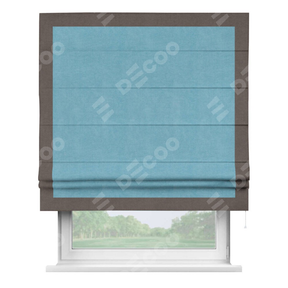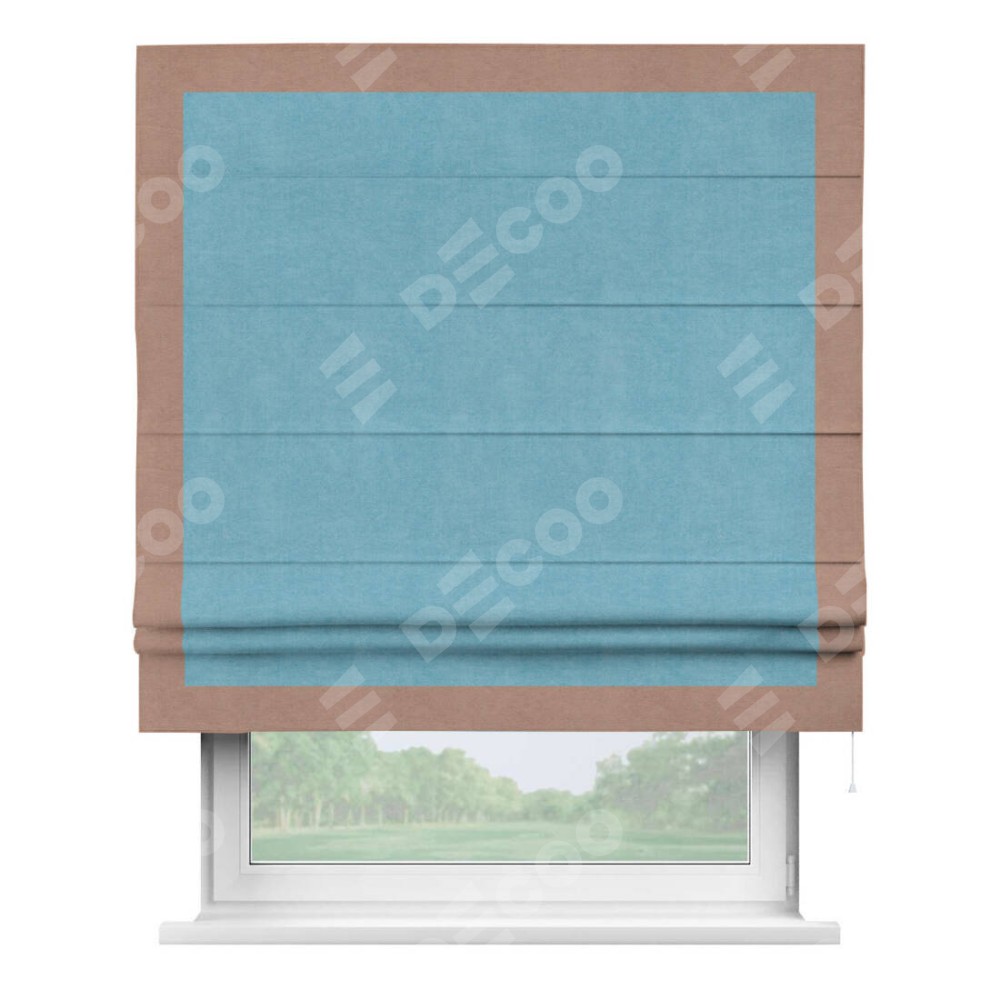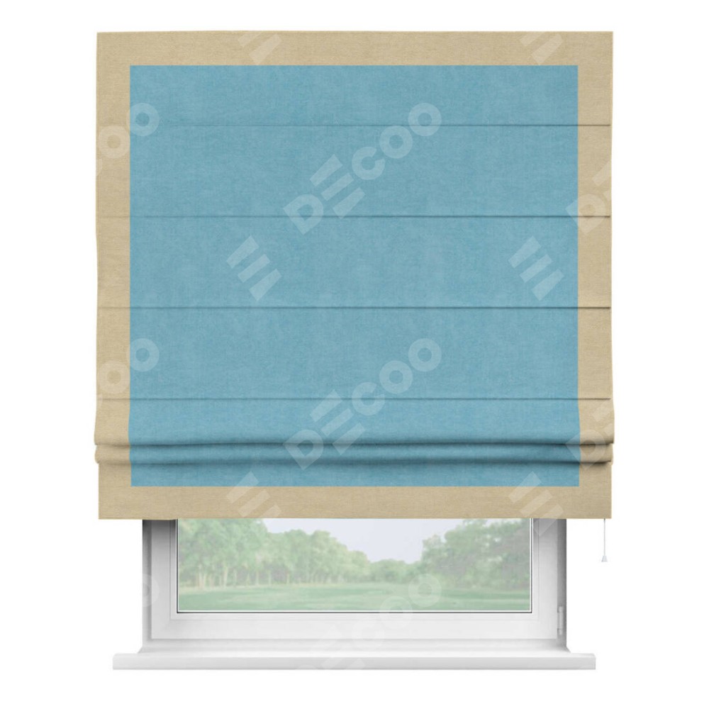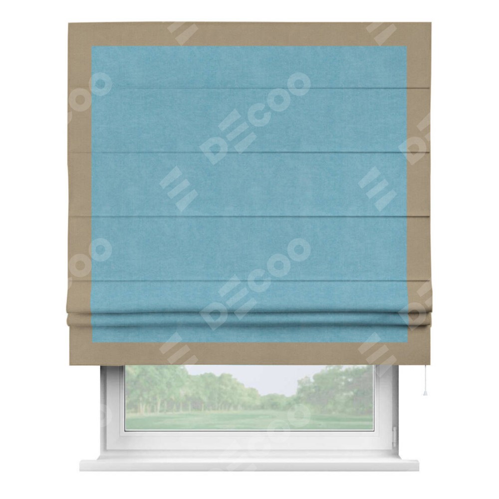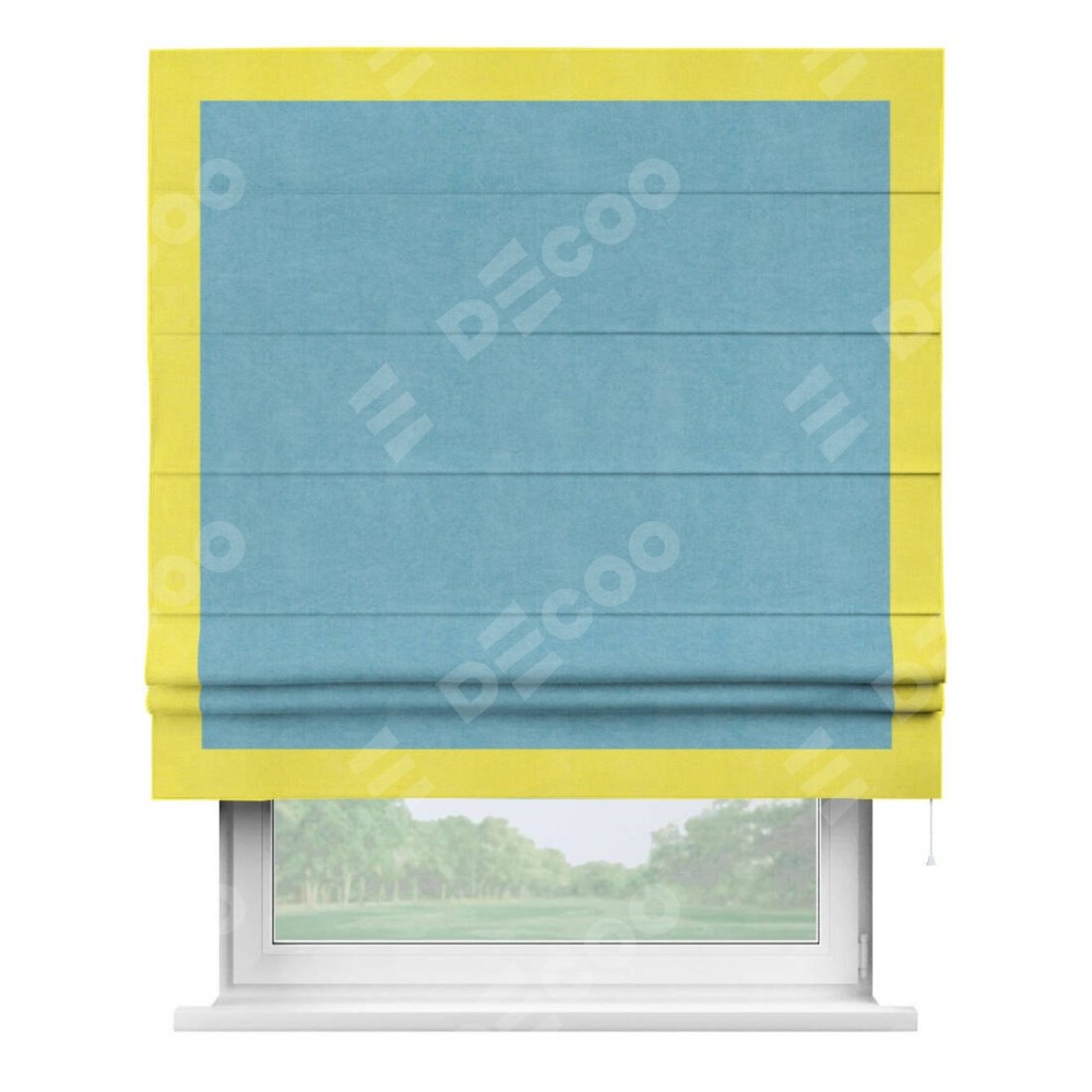 Римская штора производителя «Cortin», используется для проёма, пошита из ткани вельвет ментоловый, артикул ткани 10443. Отделка шторы кантом «Чесс», ткань для канта используется из вельвета разной расцветки на выбор. Имеет универсальный механизм и подходит для монтажа: на потолок, на стену и в нишу.