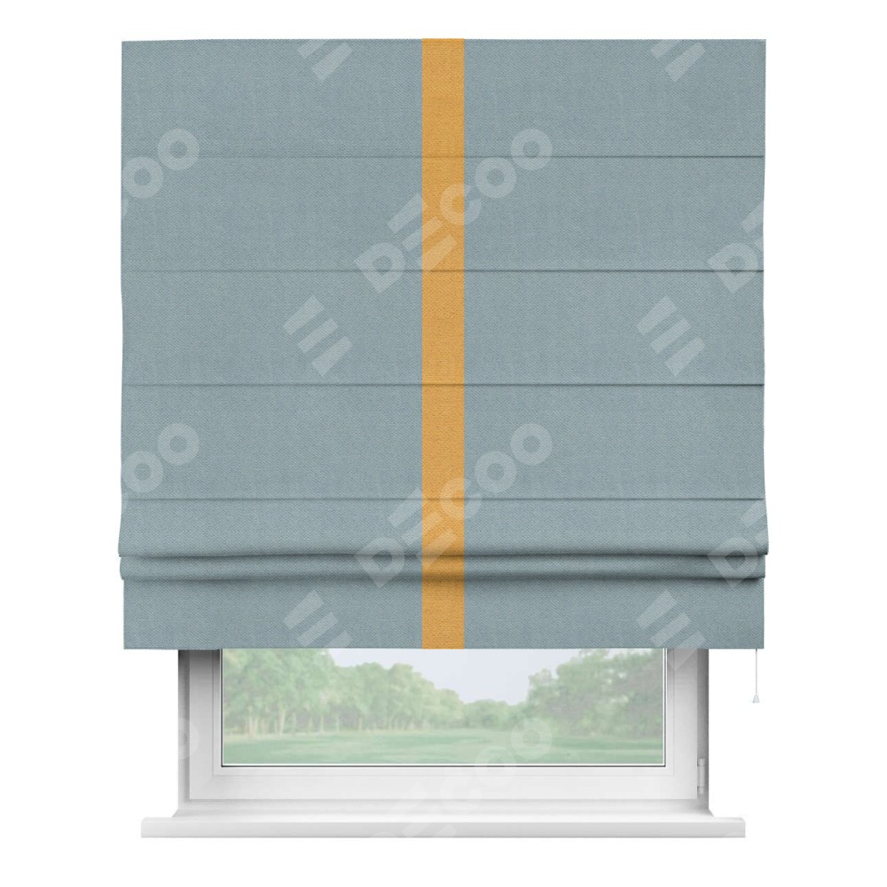 Римская штора производителя «Cortin», используется для проёма, пошита из ткани блэкаут с блеском синий, артикул 34625. Отделка шторы кантом «Хайвэй», ткань для канта используется из блэкаута с блеском разной расцветки на выбор. Изнаночная сторона материала черного цвета, что обеспечивает необходимую светонепроницаемость. Имеет универсальный механизм и подходит для монтажа: на потолок, на стену и в нишу.