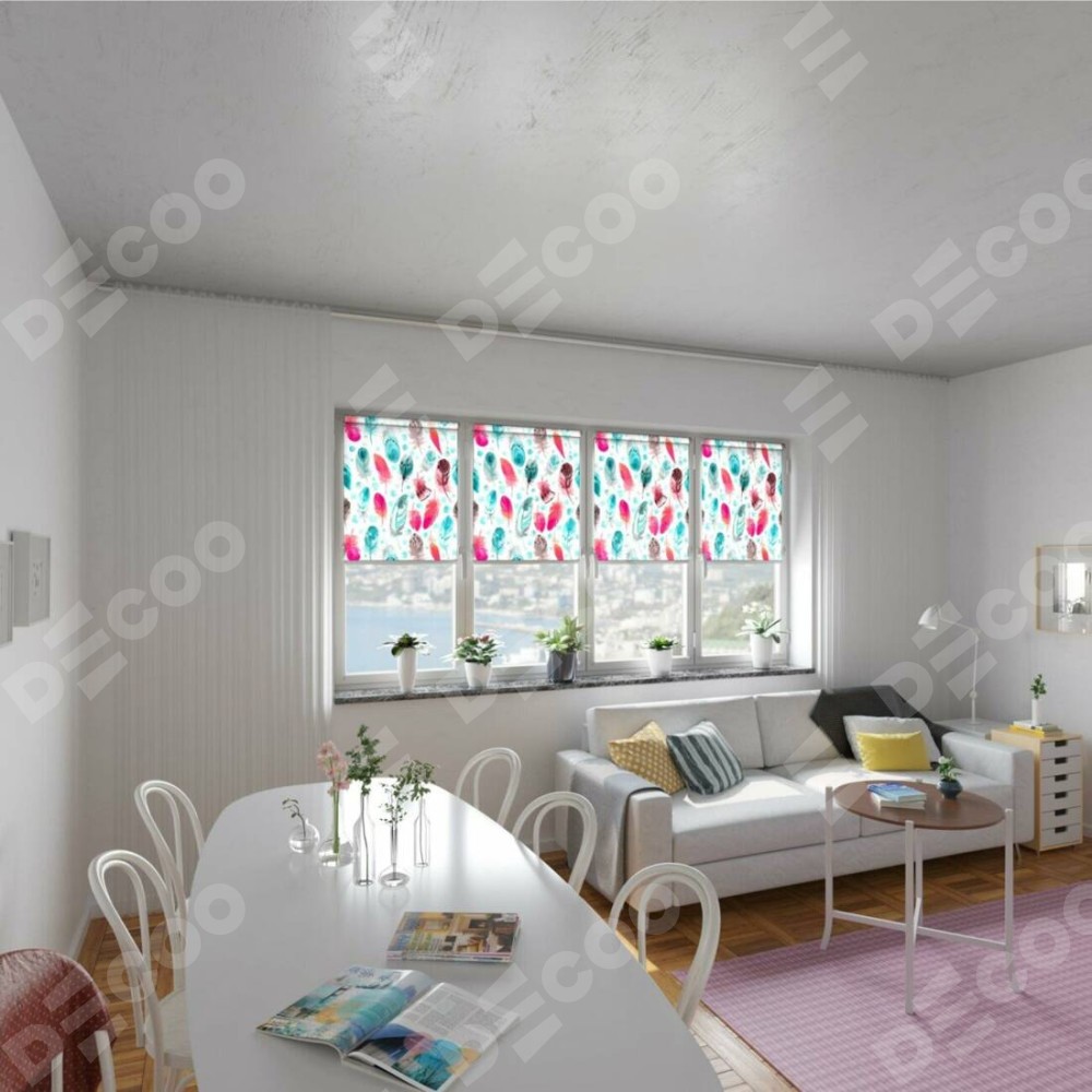Заказать Рулонная штора Мини с принтом Перья по индивидуальным размерам. Артикул товара: 197. Цена заказа на изделие будет зависеть от размеров и устанавливается от 1 500 руб. В магазине Decoo вы можете купить рулонные шторы в любых характеристиках.