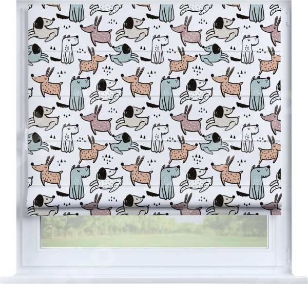 Римская штора производителя «Cortin», устанавливается на створку окна, пошита из ткани блэкаут с нанесением сублимационной печати «Очаровательные щеночки». Штора шьётся по индивидуальным размерам, для данного типа римской шторы возможная ширина от 35 до 150 см., высота до 250 см.