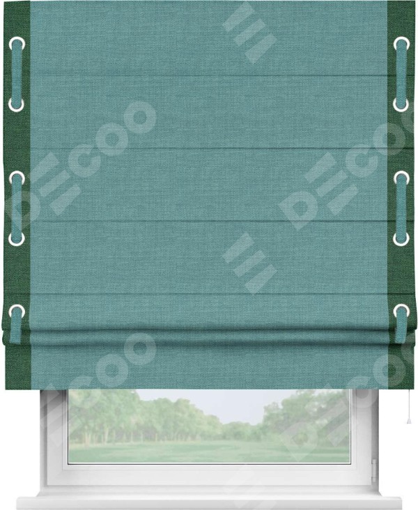 Римская штора производителя «Cortin», используется для проёма, пошита из ткани лён бирюза, артикул 7446. Отделка шторы кантом «Стрим Дуо» на кантах расположены люверсы с пояском, ткань для канта используется из льна разной расцветки на выбор. Ткань для пояска обычно используется из основной ткани шторы, а так же можно сделать из любой расцветки по желанию. Имеет универсальный механизм и подходит для монтажа: на потолок, на стену и в нишу.