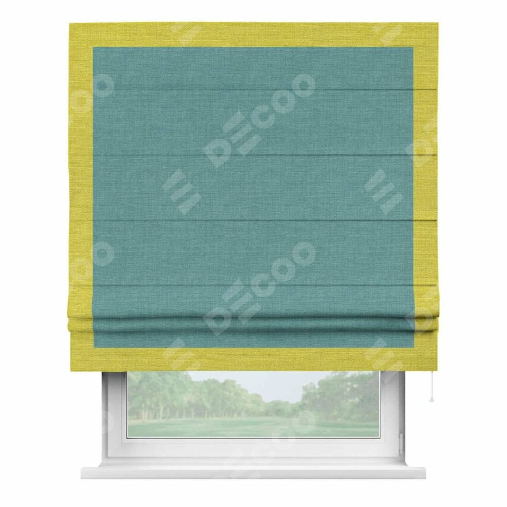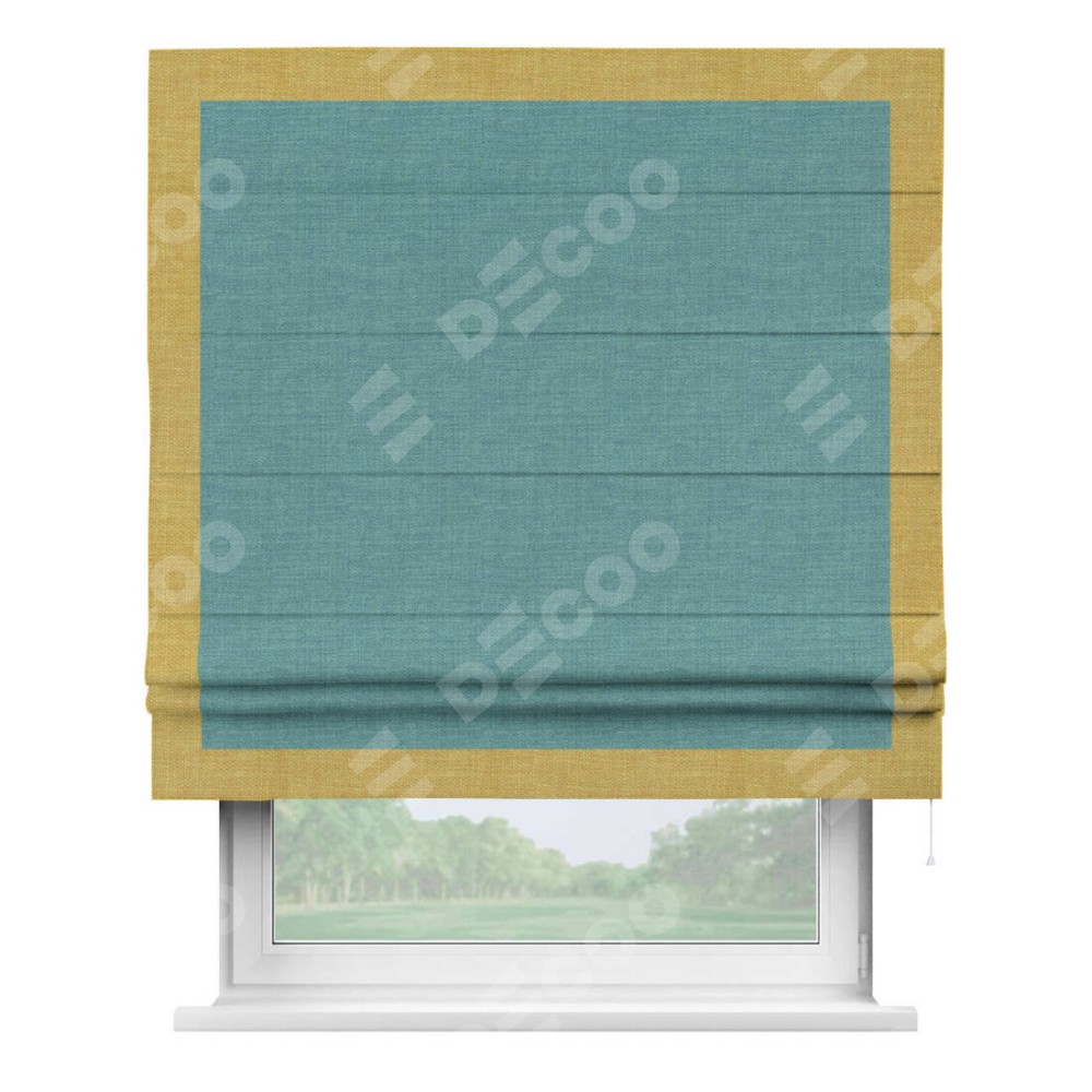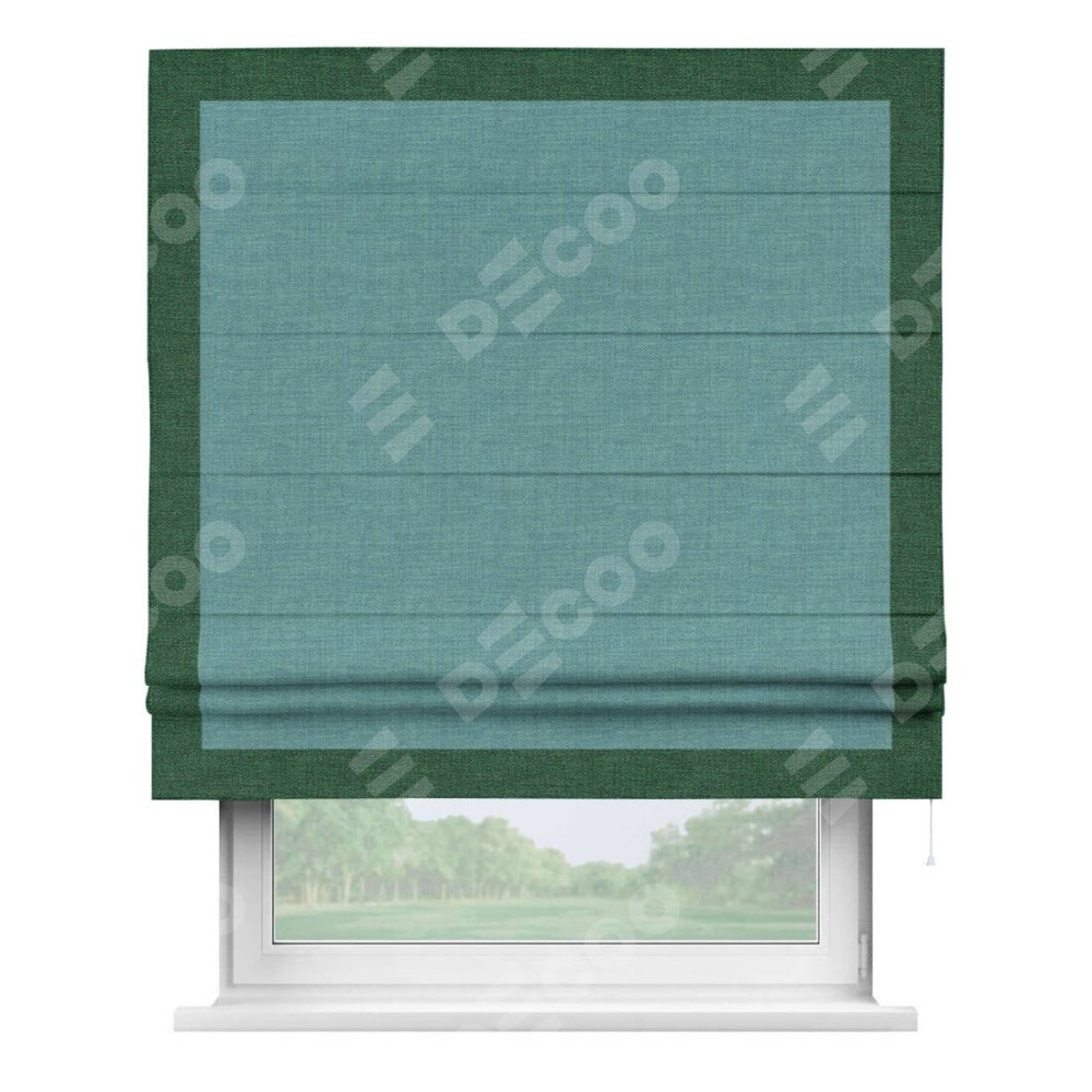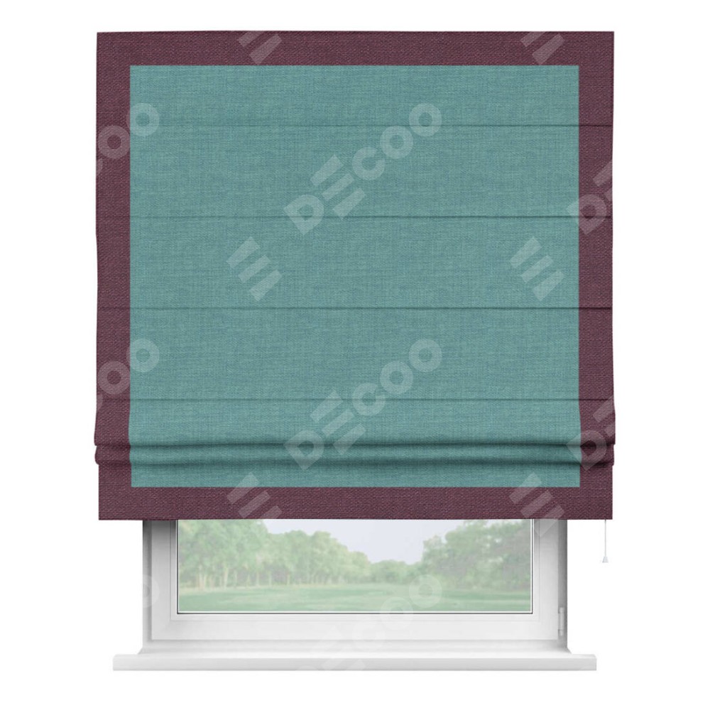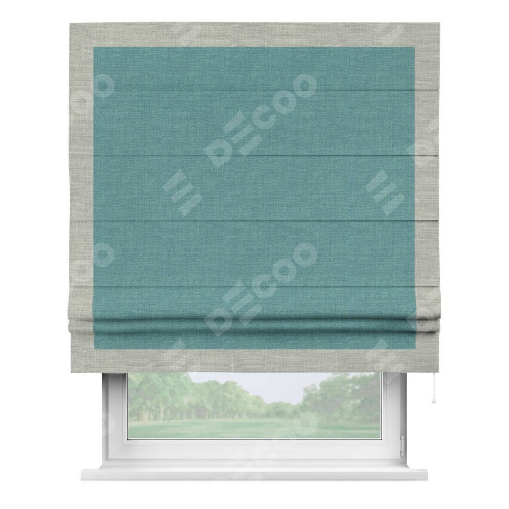 Римская штора производителя «Cortin», используется для проёма, пошита из ткани лён бирюза, артикул 7446. Отделка шторы кантом «Чесс», ткань для канта используется из льна разной расцветки на выбор. Имеет универсальный механизм и подходит для монтажа: на потолок, на стену и в нишу.