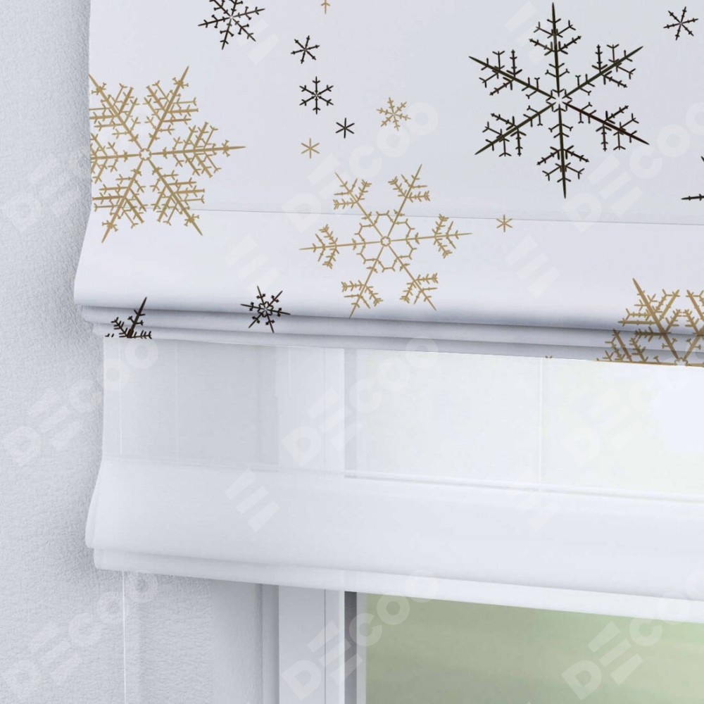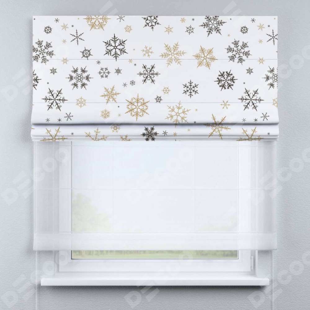 Римская штора день-ночь производителя «Cortin», используется для проёма, пошита из двух полотен, с лицевой блэкаут с нанесением сублимационной печати «Зимняя метель», вторая ткань тюль (по стандарту комплектуется тюль белого цвета артикул V-01). Имеет универсальный механизм и подходит для монтажа: на потолок, на стену и в нишу.