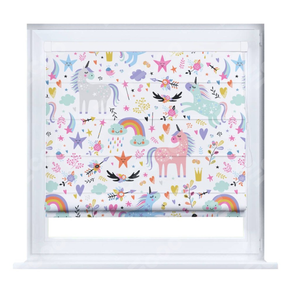 Римская штора производителя «Cortin», устанавливается на створку окна, пошита из ткани блэкаут с нанесением сублимационной печати «Радужные единороги». Штора шьётся по индивидуальным размерам, для данного типа римской шторы возможная ширина от 35 до 150 см., высота до 250 см.