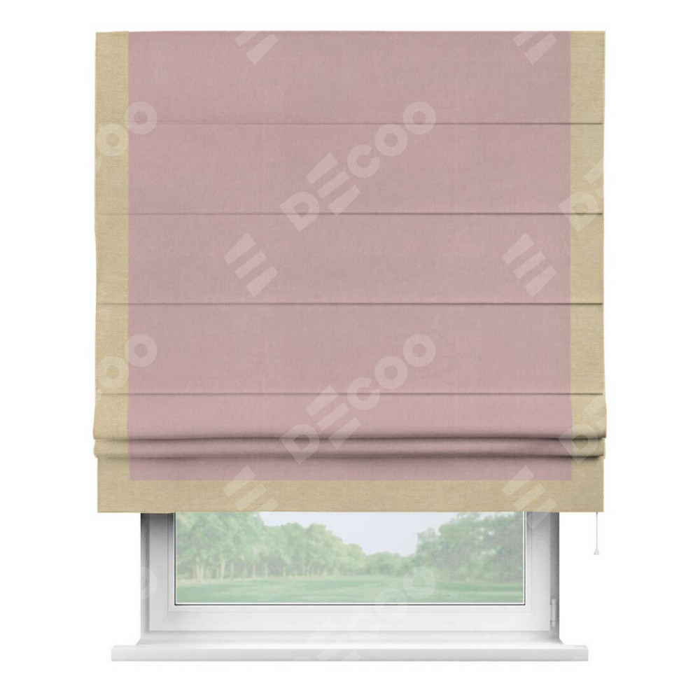Римская штора производителя «Cortin», используется для проёма, пошита из ткани вельвет розовая пудра, артикул ткани 14132. Отделка шторы кантом «Виктория», ткань для канта используется из вельвета разной расцветки на выбор. Имеет универсальный механизм и подходит для монтажа: на потолок, на стену и в нишу.