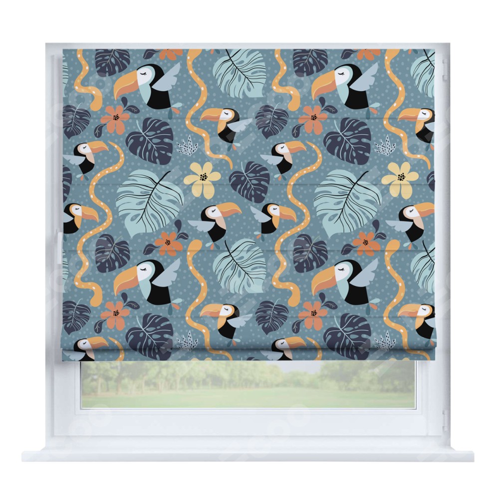 Римская штора производителя «Cortin», устанавливается на створку окна, пошита из ткани блэкаут с нанесением сублимационной печати «Экзотические птицы». Штора шьётся по индивидуальным размерам, для данного типа римской шторы возможная ширина от 35 до 150 см., высота до 250 см.