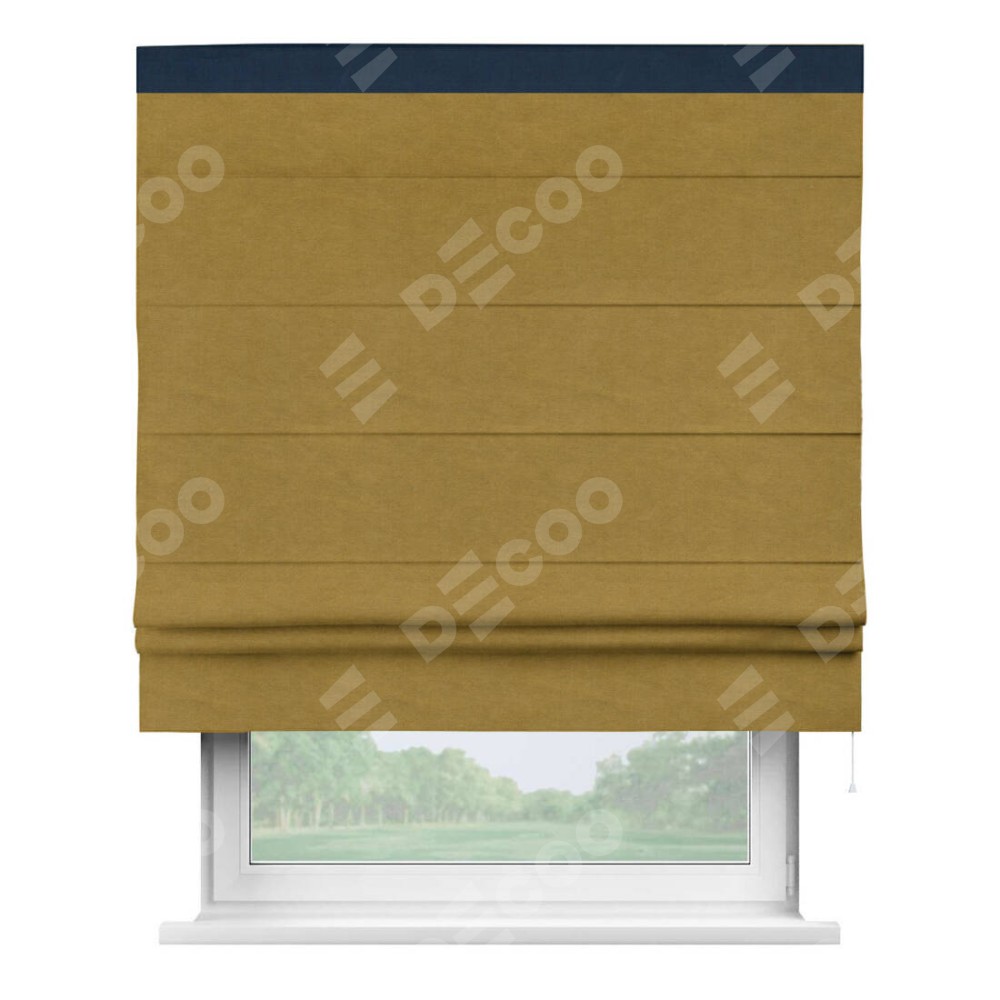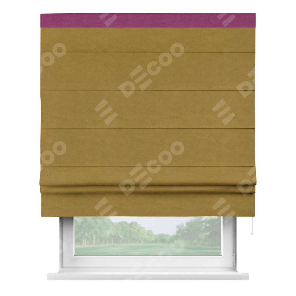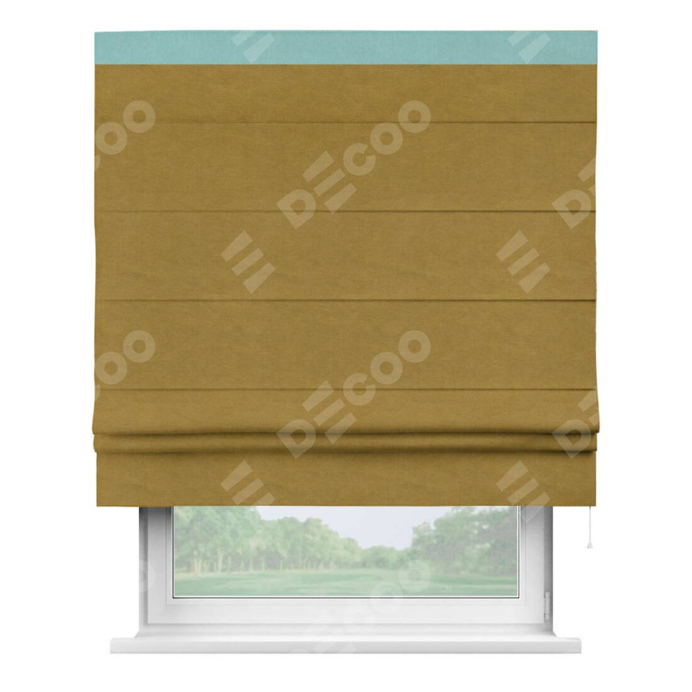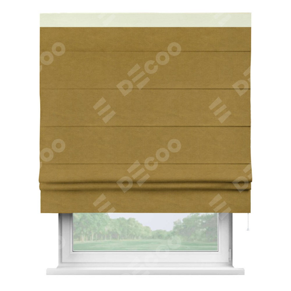 Римская штора производителя «Cortin», используется для проёма, пошита из ткани вельвет светло-коричневый, артикул ткани 4973. Отделка шторы кантом «Кинг», ткань для канта используется из вельвета разной расцветки на выбор. Имеет универсальный механизм и подходит для монтажа: на потолок, на стену и в нишу.