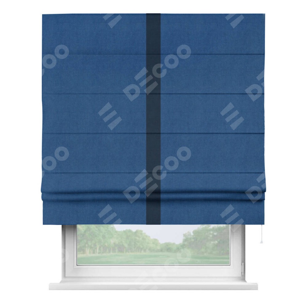 Римская штора производителя «Cortin», используется для проёма, пошита из ткани вельвет синий, артикул ткани 85554. Отделка шторы кантом «Хайвей», ткань для канта используется из вельвета разной расцветки на выбор. Имеет универсальный механизм и подходит для монтажа: на потолок, на стену и в нишу.