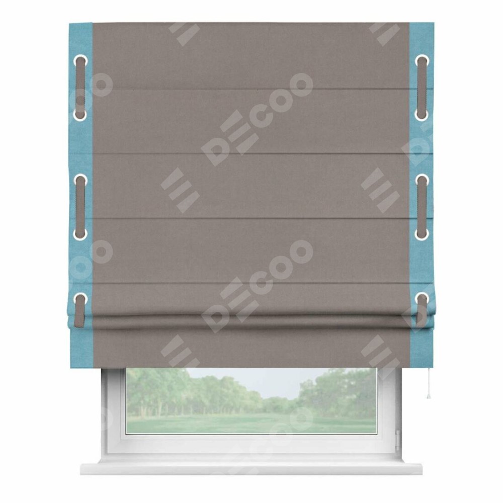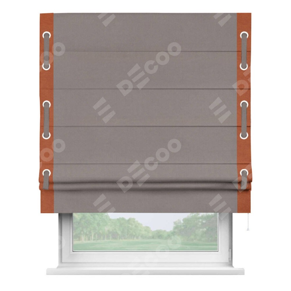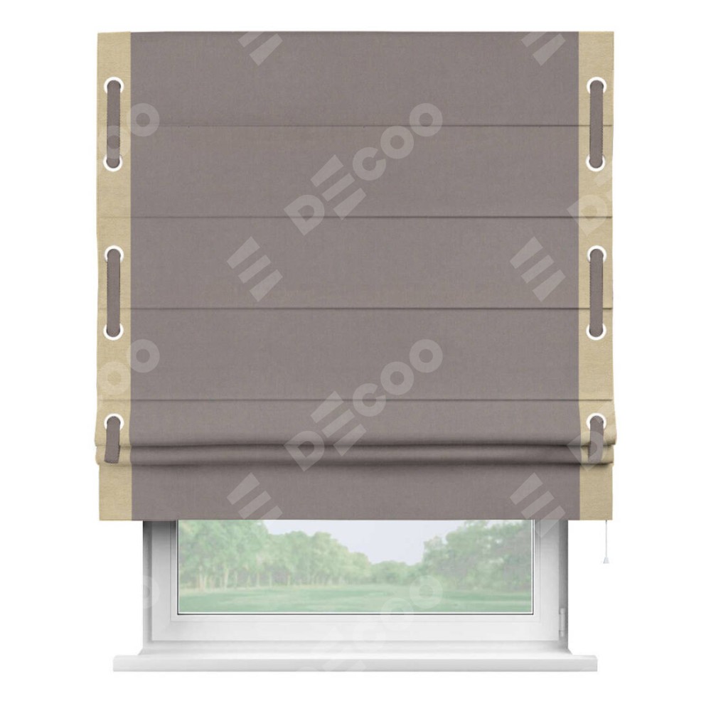 Римская штора производителя «Cortin», используется для проёма, пошита из ткани вельвет темно-бежевый, артикул ткани 82527. Отделка шторы кантом «Стрим Дуо» на кантах расположены люверсы с пояском, ткань для канта используется из вельвета разной расцветки на выбор. Ткань для пояска обычно используется из основной ткани шторы, а так же можно сделать из любой расцветки по желанию. Имеет универсальный механизм и подходит для монтажа: на потолок, на стену и в нишу.