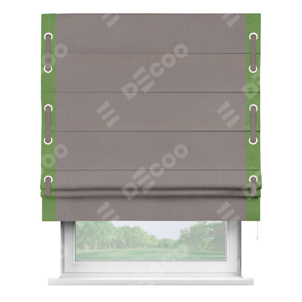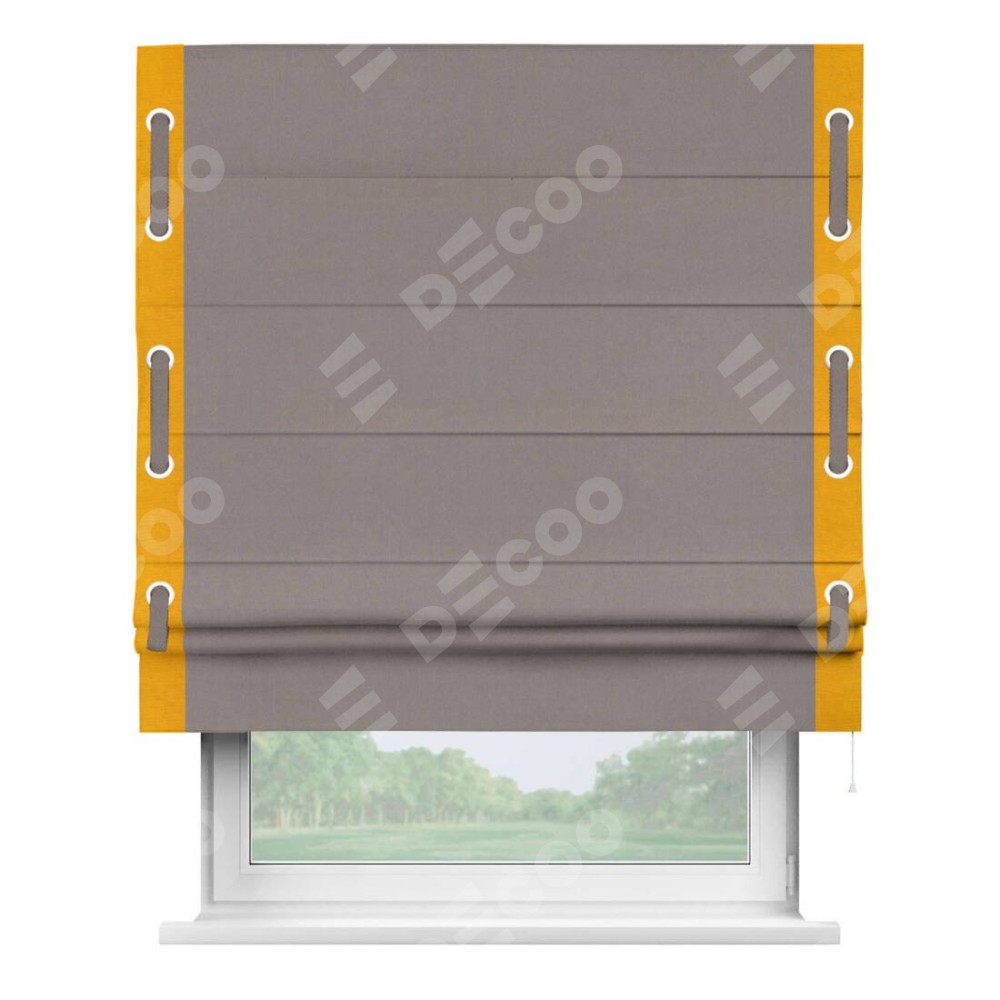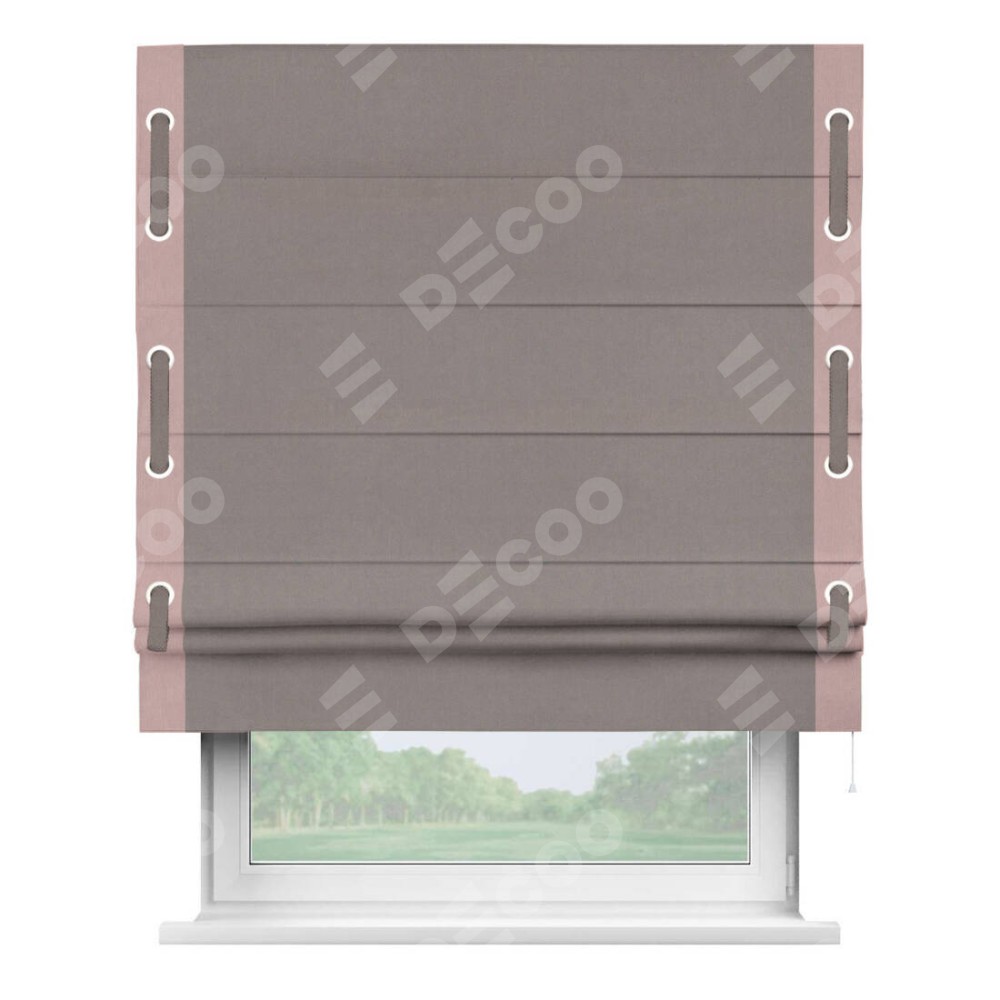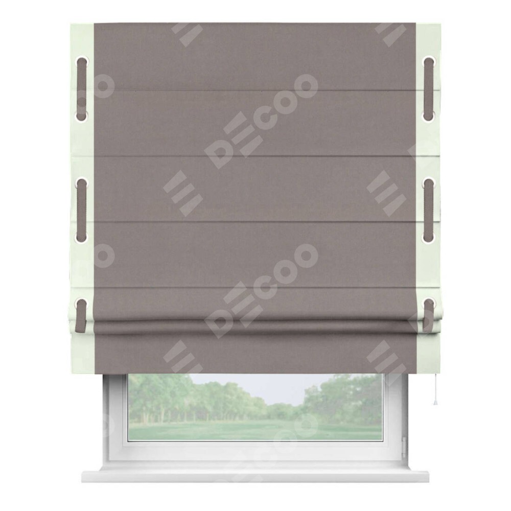 Римская штора производителя «Cortin», используется для проёма, пошита из ткани вельвет темно-бежевый, артикул ткани 82527. Отделка шторы кантом «Стрим Дуо» на кантах расположены люверсы с пояском, ткань для канта используется из вельвета разной расцветки на выбор. Ткань для пояска обычно используется из основной ткани шторы, а так же можно сделать из любой расцветки по желанию. Имеет универсальный механизм и подходит для монтажа: на потолок, на стену и в нишу.
