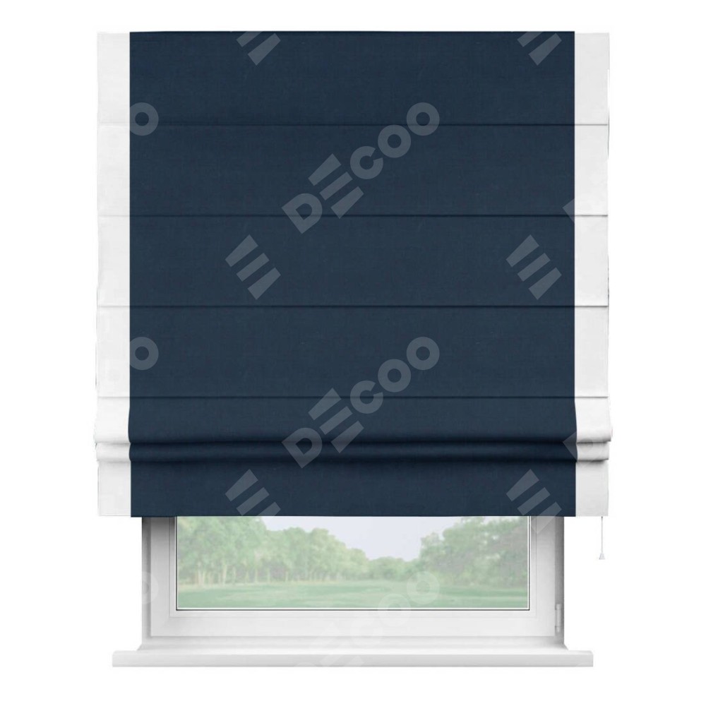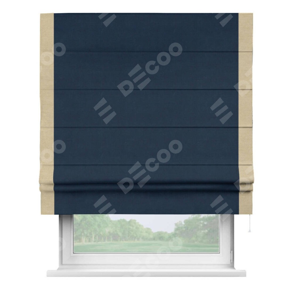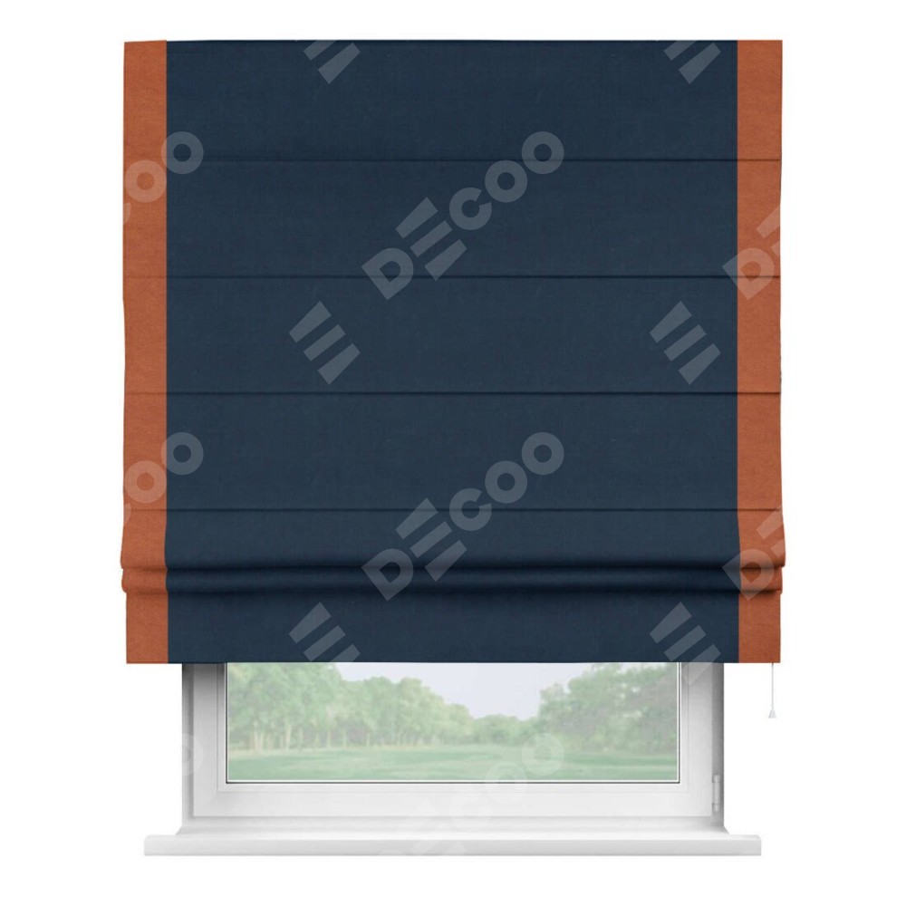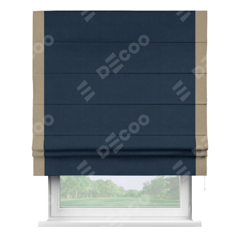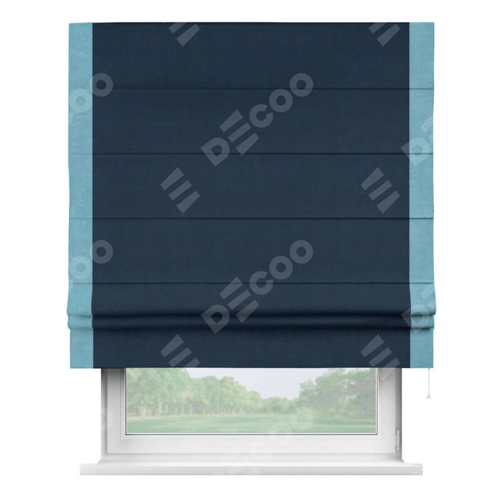 Римская штора производителя «Cortin», используется для проёма, пошита из ткани вельвет темно-синий, артикул ткани 14152. Отделка шторы кантом «Стрим Дуо», ткань для канта используется из вельвета разной расцветки на выбор. Имеет универсальный механизм и подходит для монтажа: на потолок, на стену и в нишу.
