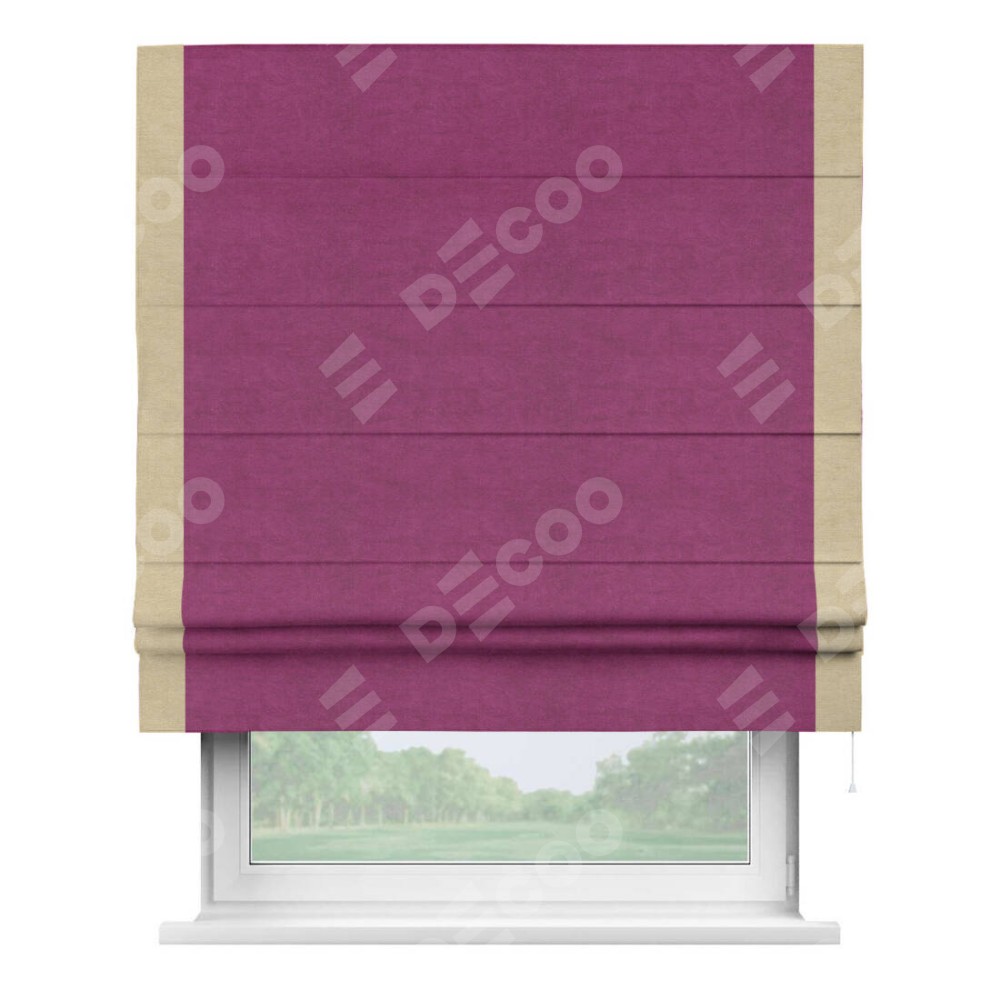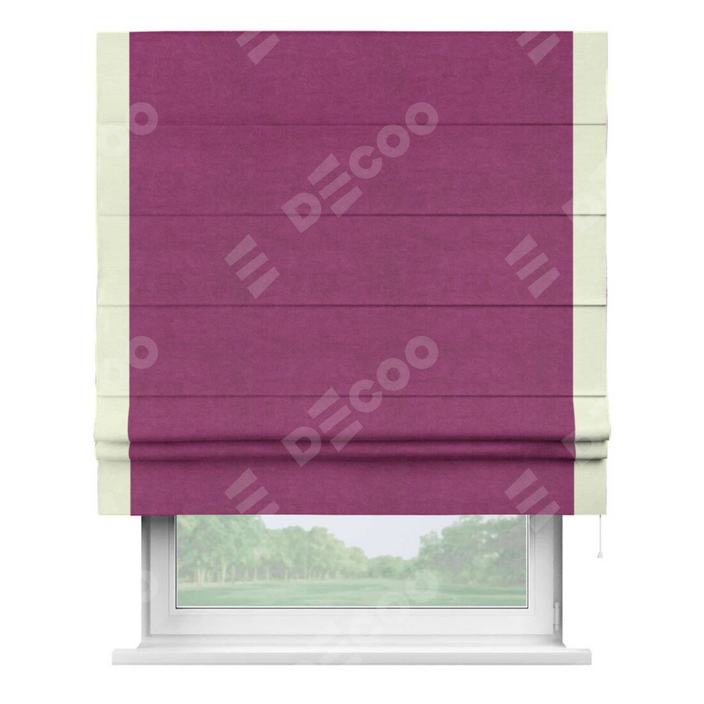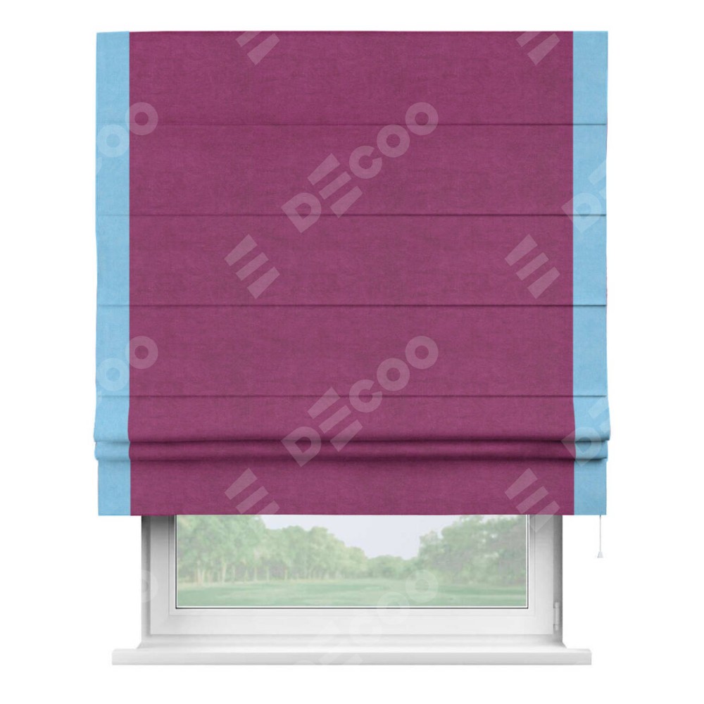 Римская штора производителя «Cortin», используется для проёма, пошита из ткани вельвет фиолетовый, артикул ткани 85552. Отделка шторы кантом «Стрим Дуо», ткань для канта используется из вельвета разной расцветки на выбор. Имеет универсальный механизм и подходит для монтажа: на потолок, на стену и в нишу.