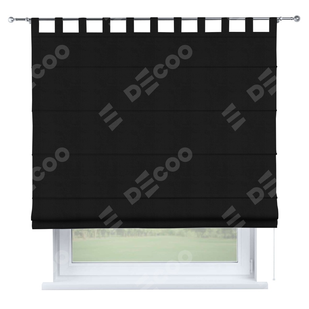 Римская штора производителя «Cortin», используется для проёма, пошита из ткани блэкаут однотонный черный, артикул ткани 79904. Данная модель пошита на петлях, комплектуется на выбор круглым карнизом и подходит для монтажа на стену. Римская штора на петлях имеет простую систему регулировки высоты, отличительным преимуществом данной модели является простой способ монтажа. Достаточно повесить ее на трубу и штора готова!