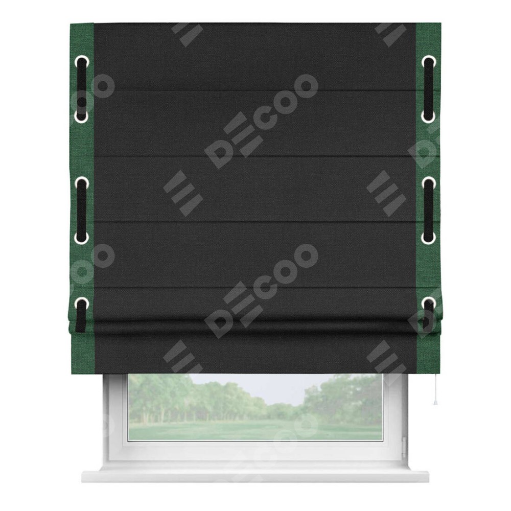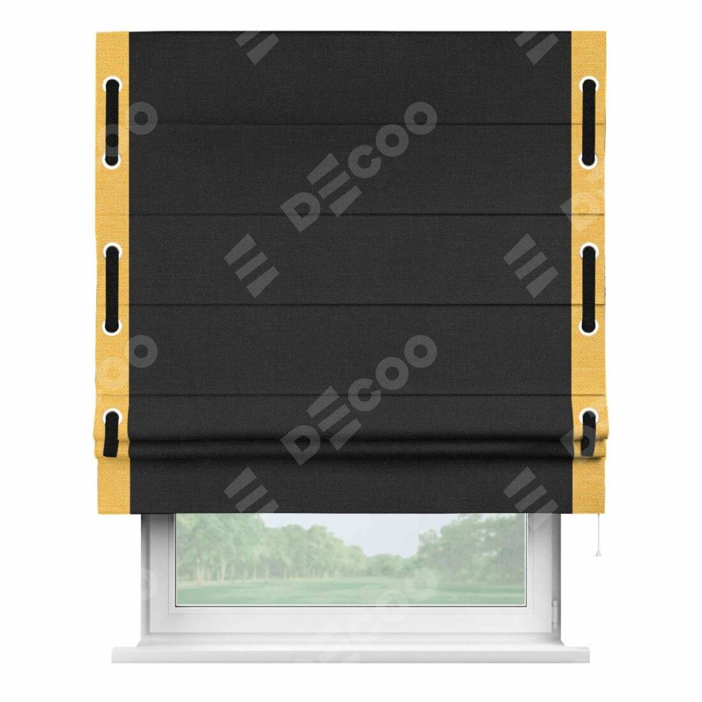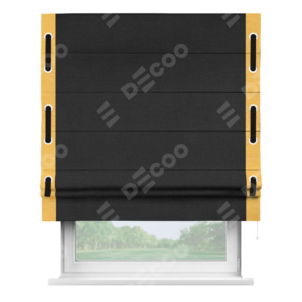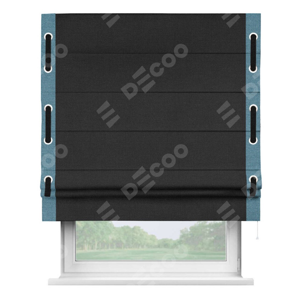 Римская штора производителя «Cortin», используется для проёма, пошита из ткани лён черный, артикул 85927. Отделка шторы кантом «Стрим Дуо» на кантах расположены люверсы с пояском, ткань для канта используется из льна разной расцветки на выбор. Ткань для пояска обычно используется из основной ткани шторы, а так же можно сделать из любой расцветки по желанию. Имеет универсальный механизм и подходит для монтажа: на потолок, на стену и в нишу.