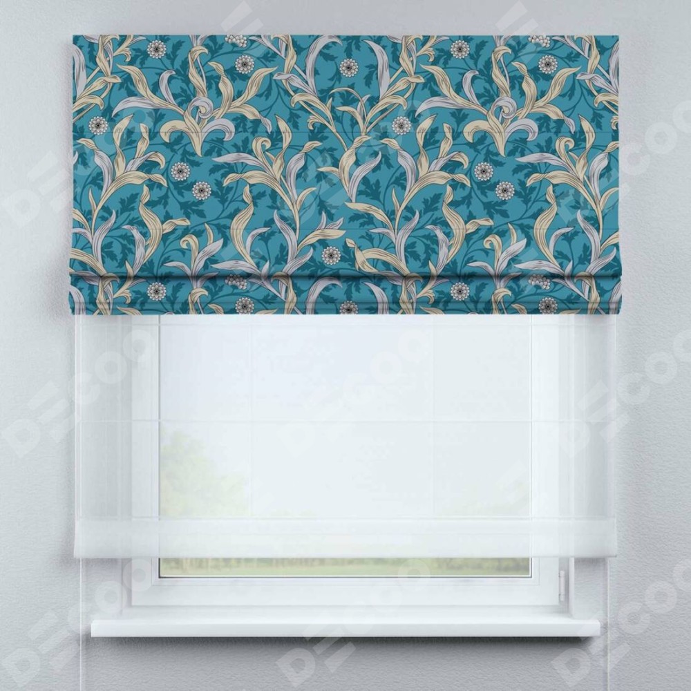 Римская штора день-ночь производителя «Cortin», используется для проёма, пошита из двух полотен, с лицевой блэкаут с нанесением сублимационной печати «Винтажные листья», вторая ткань тюль (по стандарту комплектуется тюль белого цвета артикул V-01). Имеет универсальный механизм и подходит для монтажа: на потолок, на стену и в нишу.